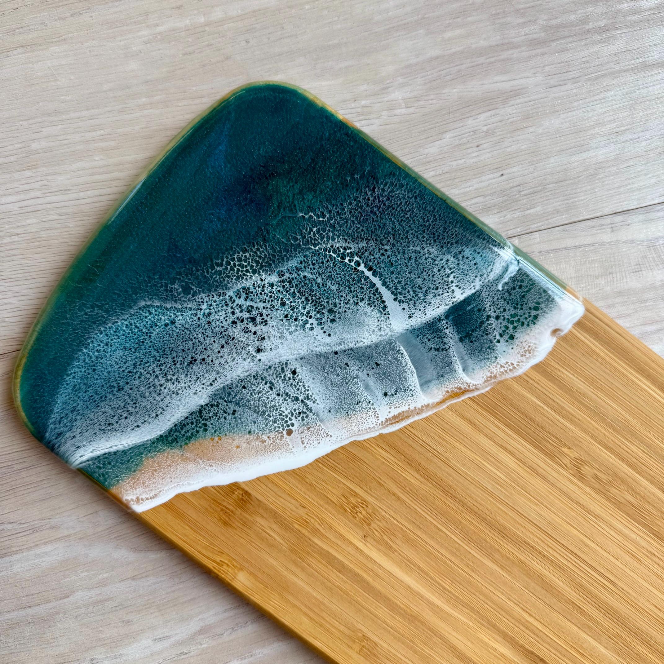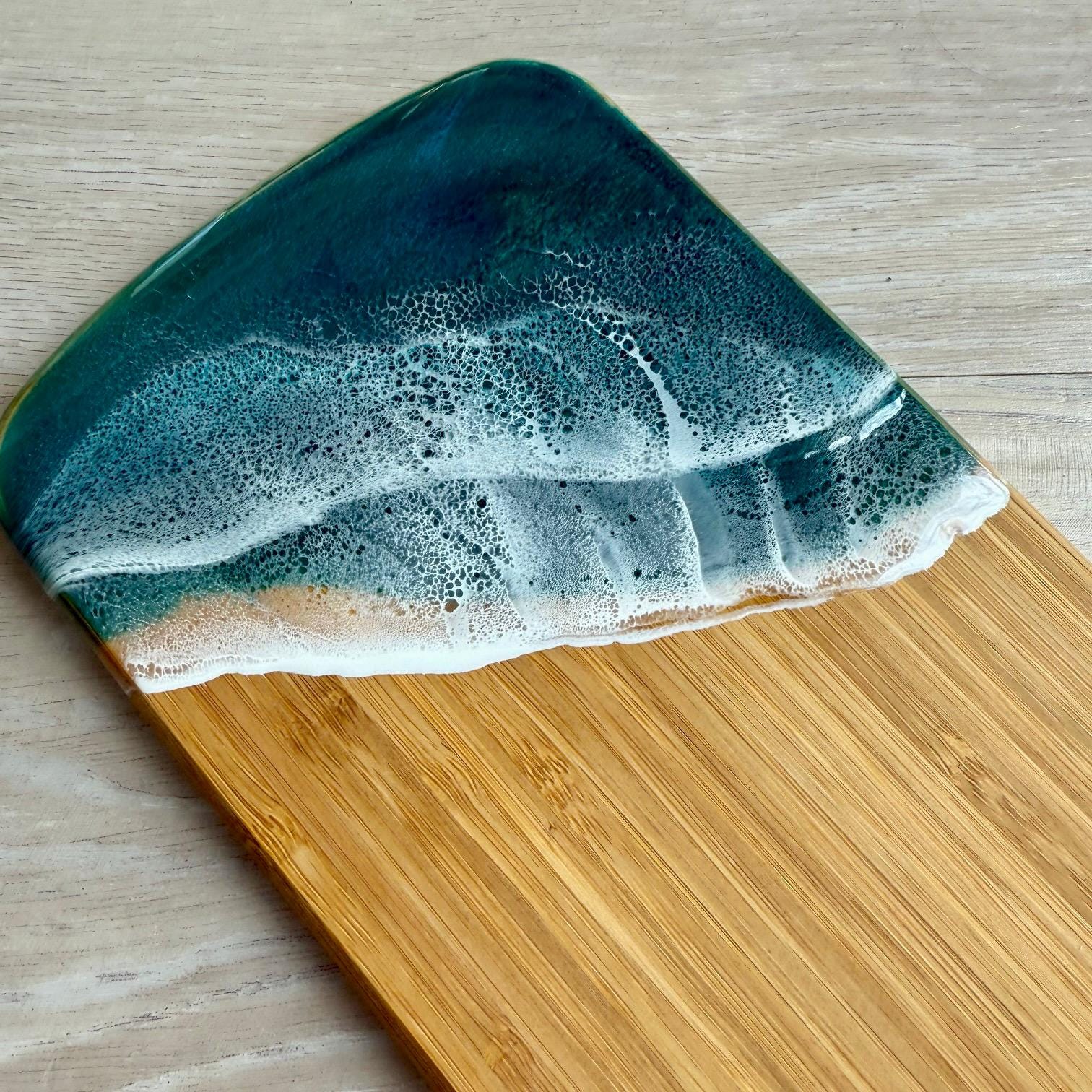 One-of-a-kind resin ocean scene on a bamboo cutting board. Perfect as a cheese board or charcuterie board.
