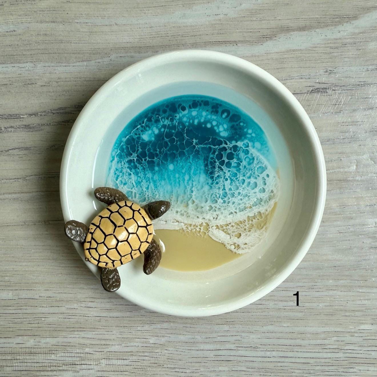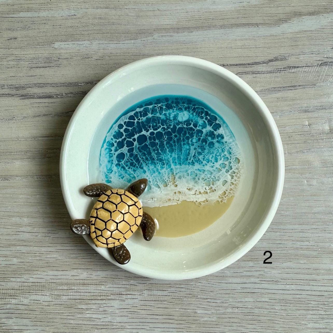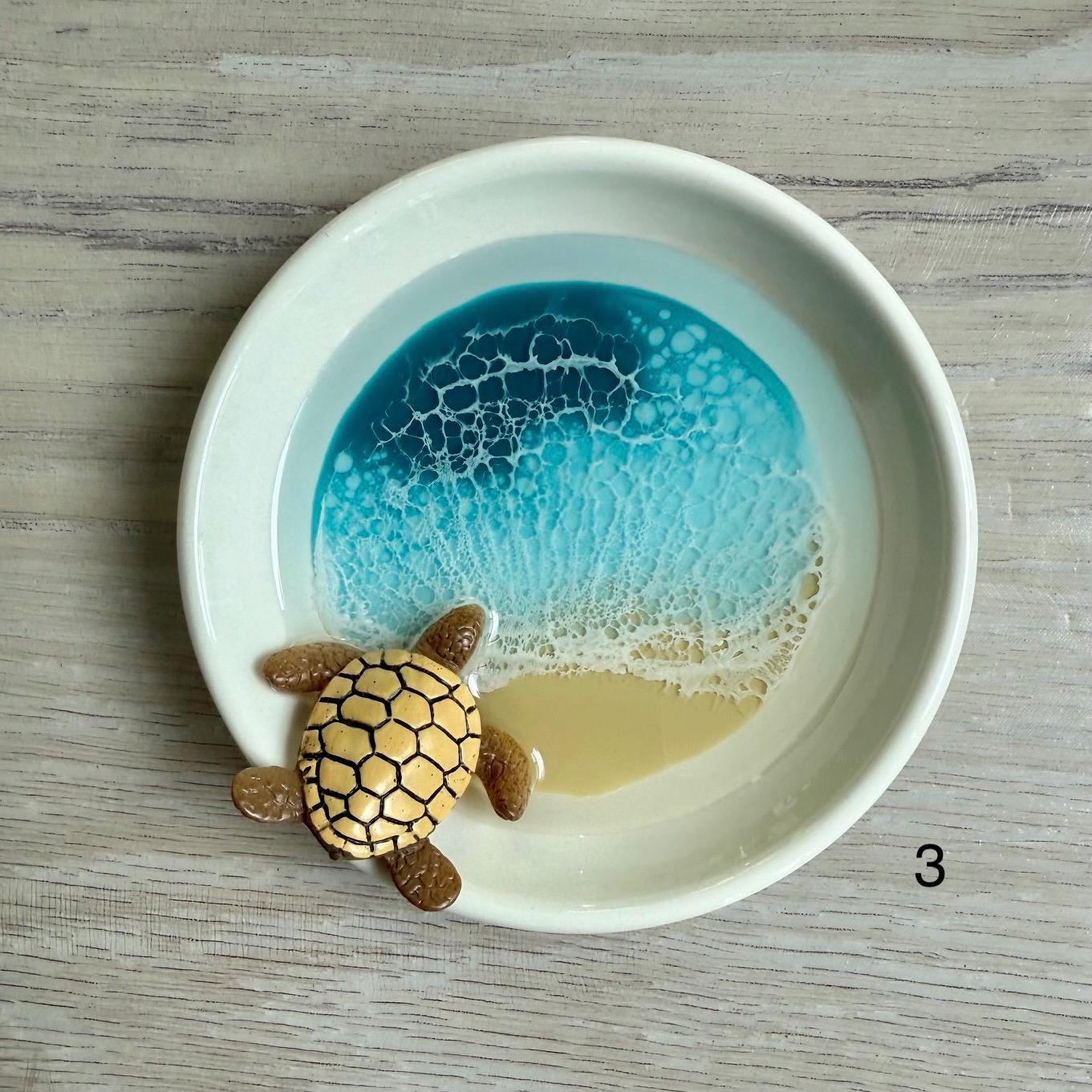 One-of-a-kind resin beach ring dish with a resin sea turtle.