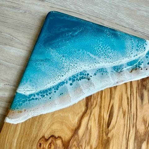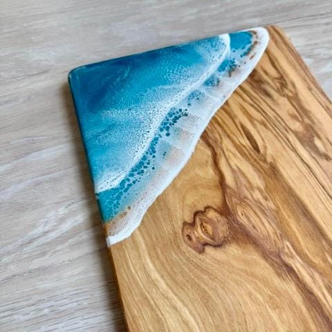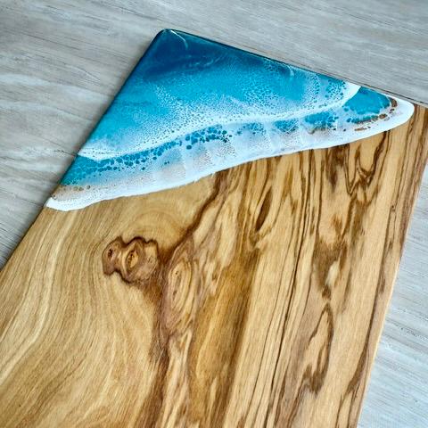 One-of-a-kind resin ocean scene on an olive wood serving board. Perfect as a cheese board or charcuterie board. Display it in your kitchen or dining room as a piece of art.