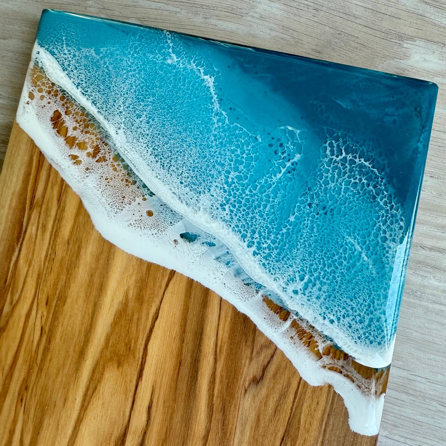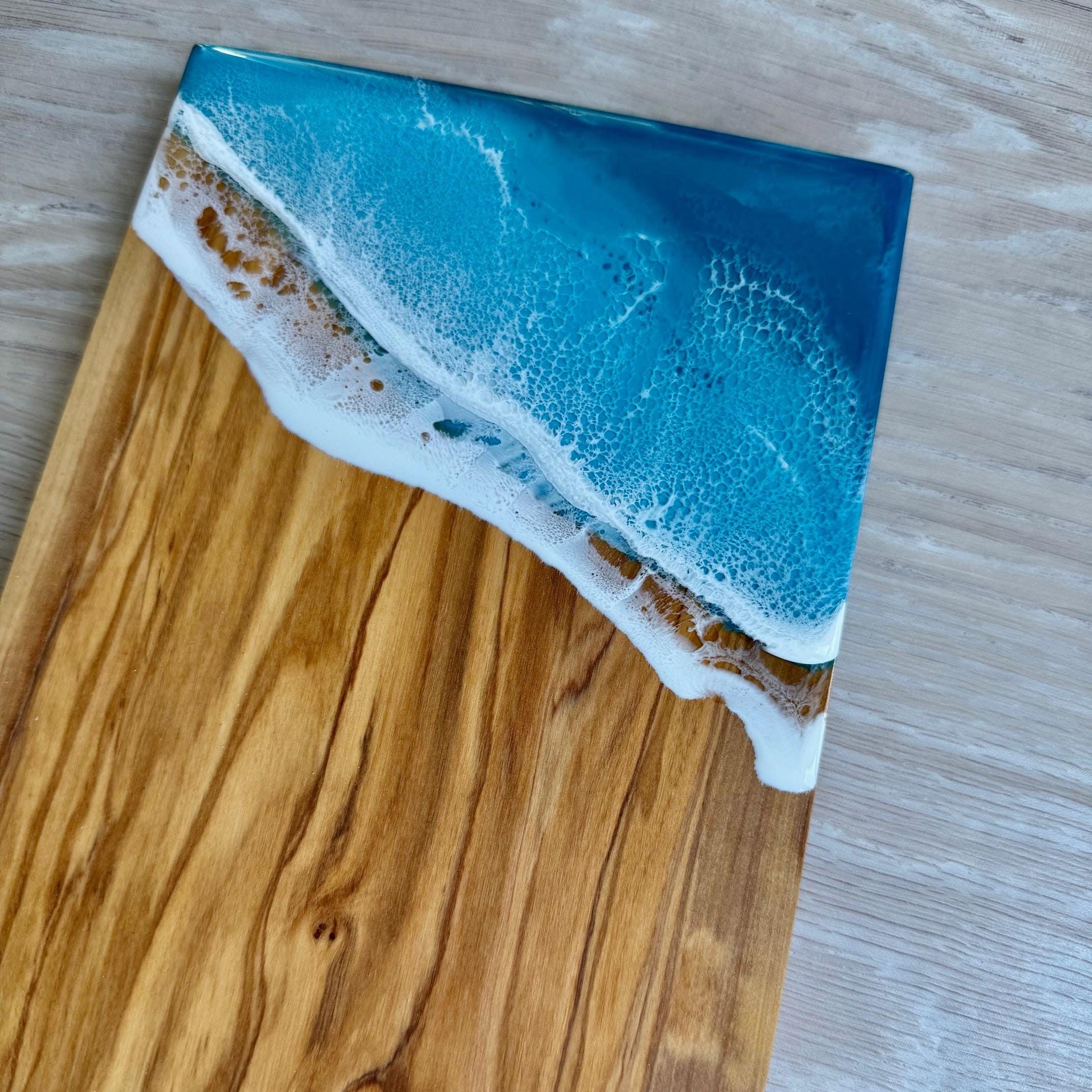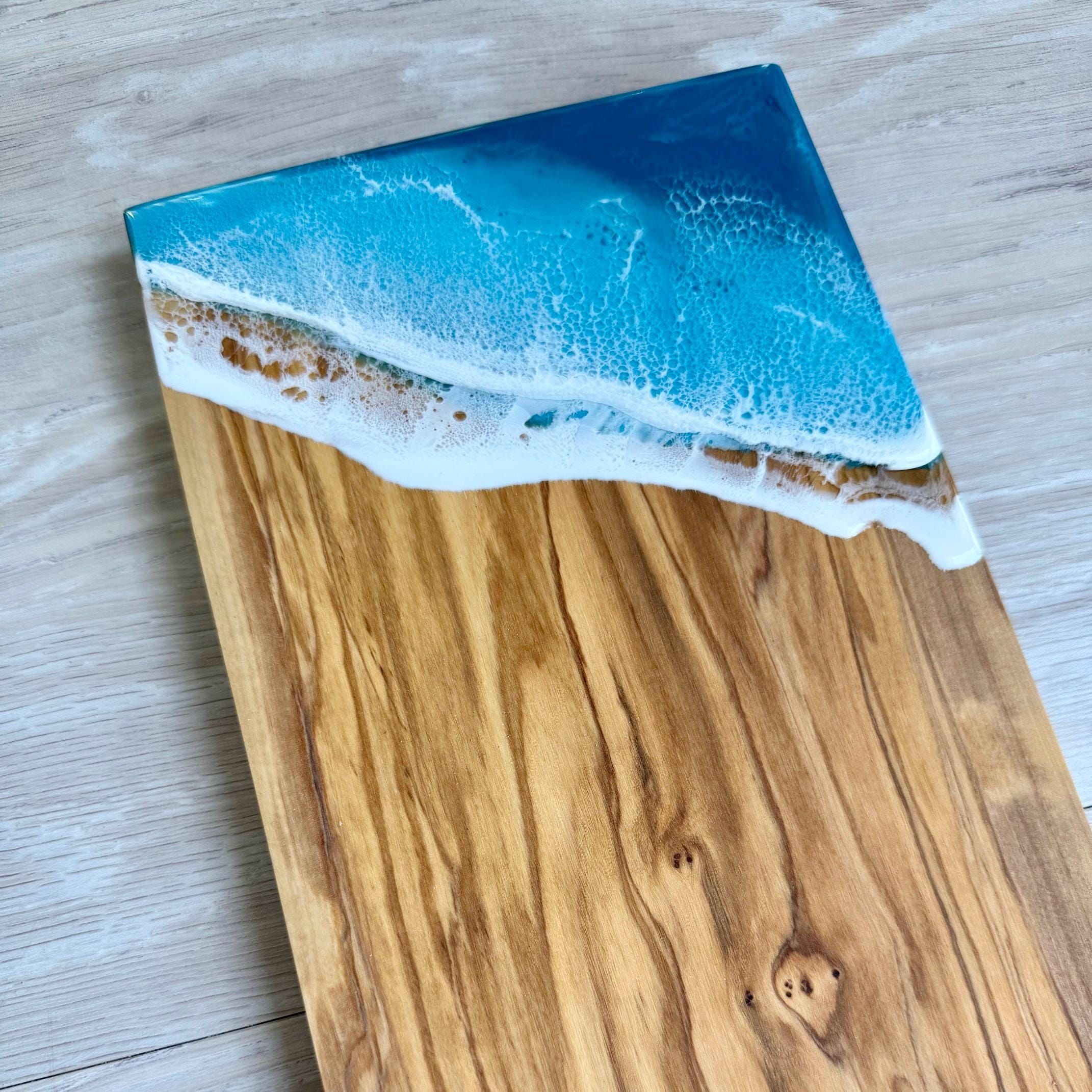 One-of-a-kind resin ocean scene on an olive wood serving board. Perfect as a cheese board or charcuterie board. Display it in your kitchen or dining room as a piece of art.