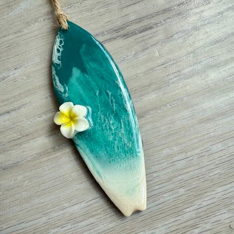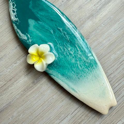 Multiple layers or resin are poured onto an 1/8" laser cut plywood surfboard with a resin plumeria added.