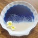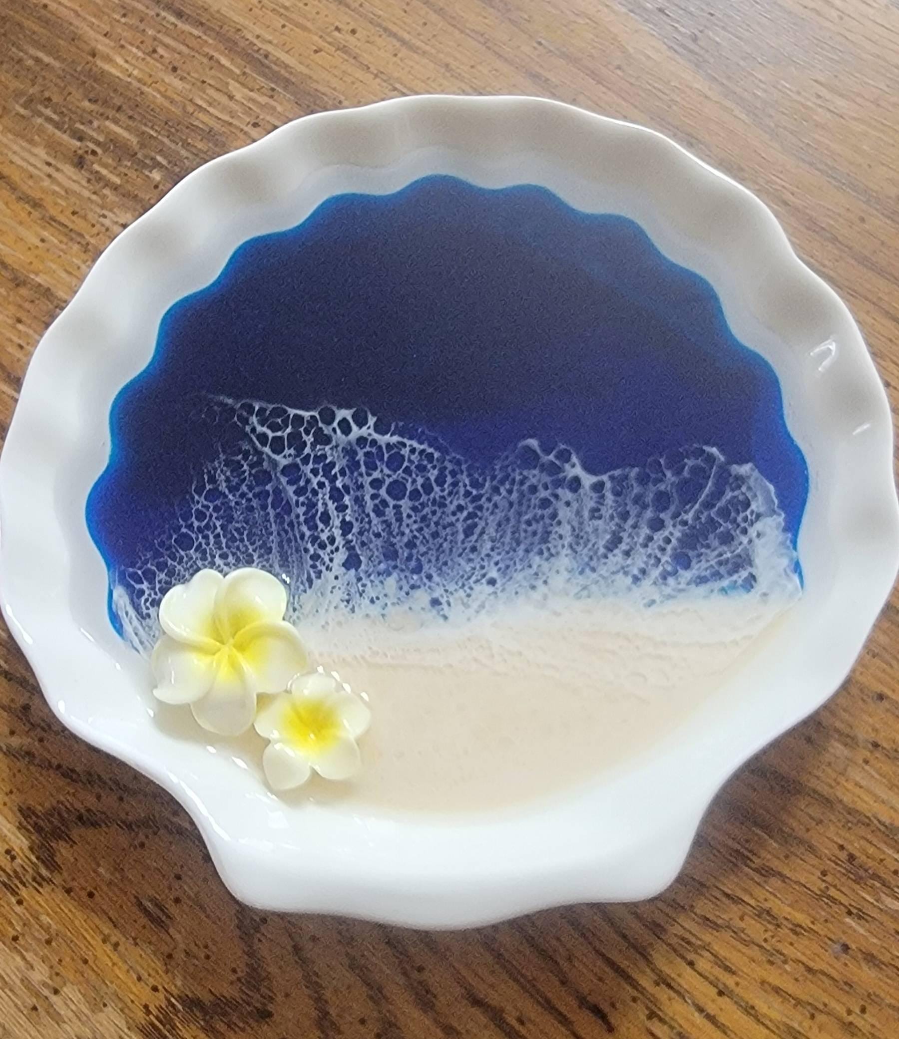 Multiple layers of resin and resin plumeria are used to create a beautiful beach scene in a seashell shaped ceramic dish.
