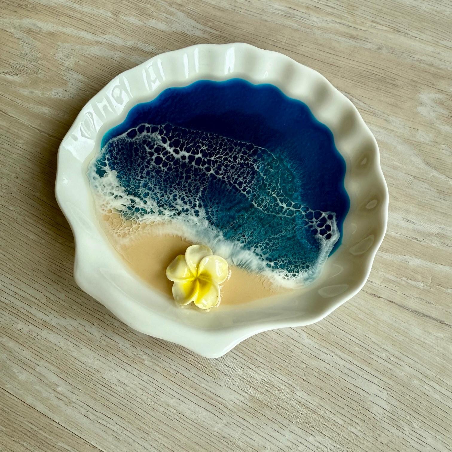 Multiple layers of resin and a plumeria flower are used to create a beautiful beach scene in a seashell shaped ceramic dish.