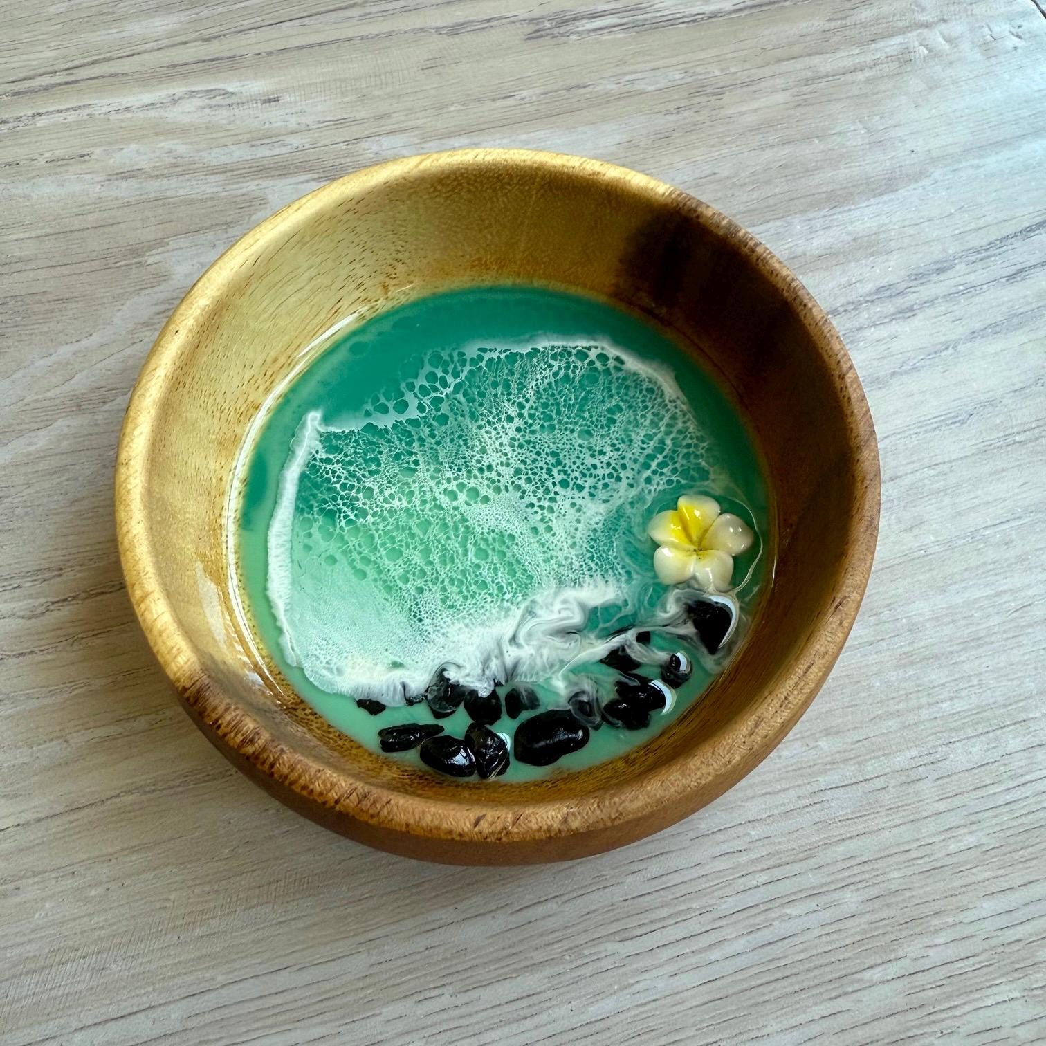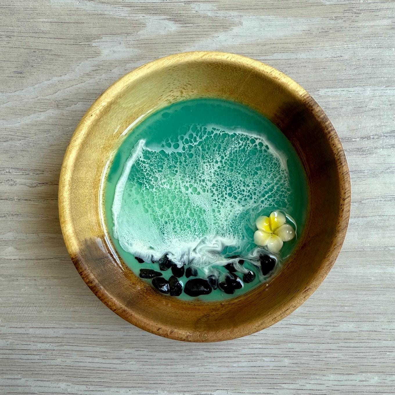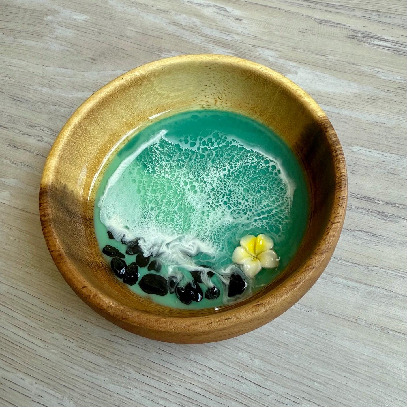 Multiple layers of resin are used to create a beautiful beach scene in an acacia wood bowl with a resin plumeria.