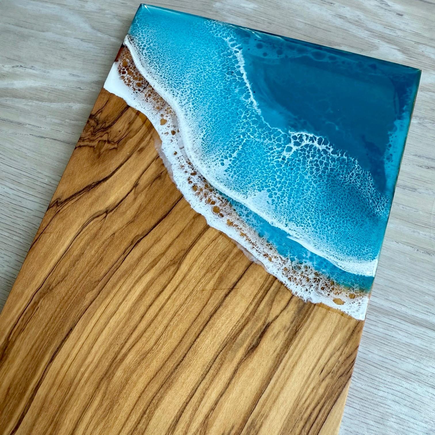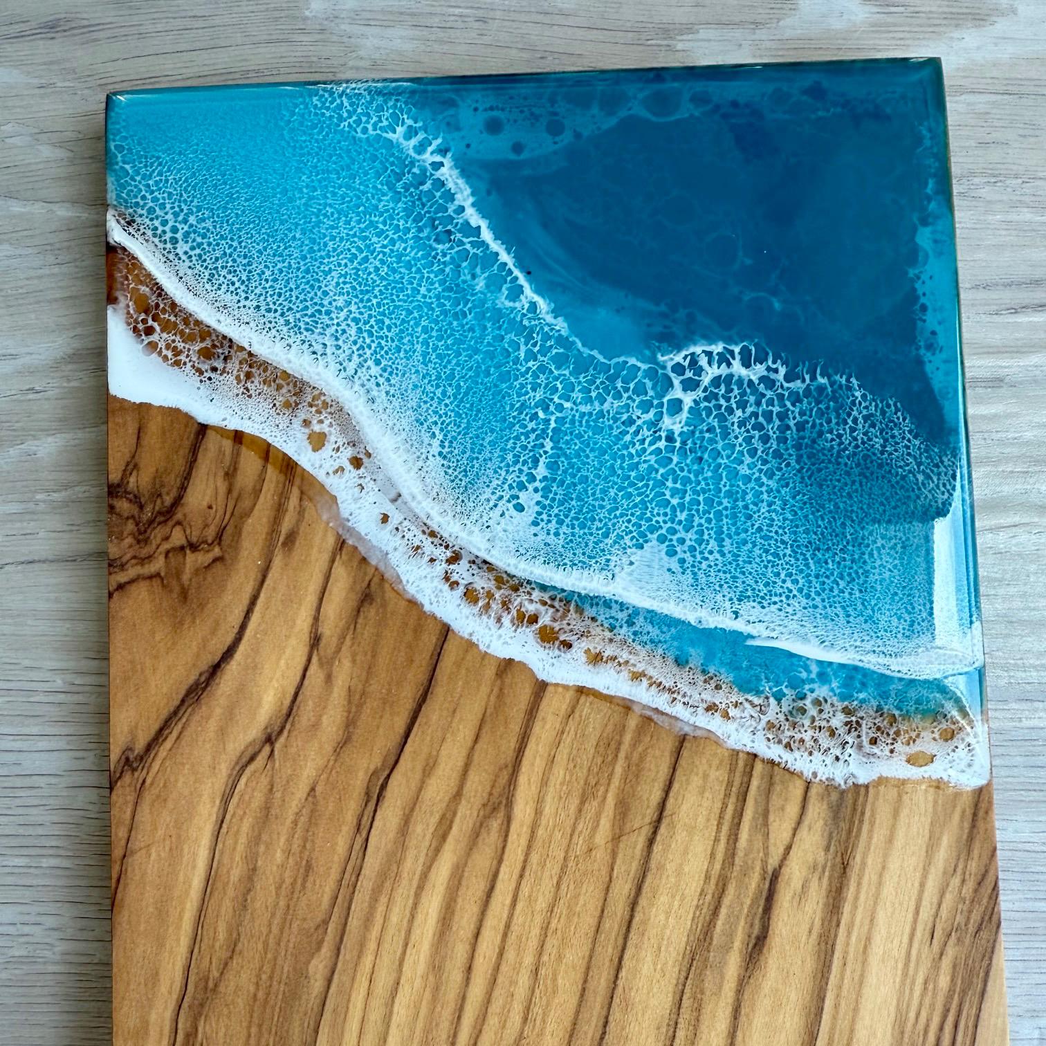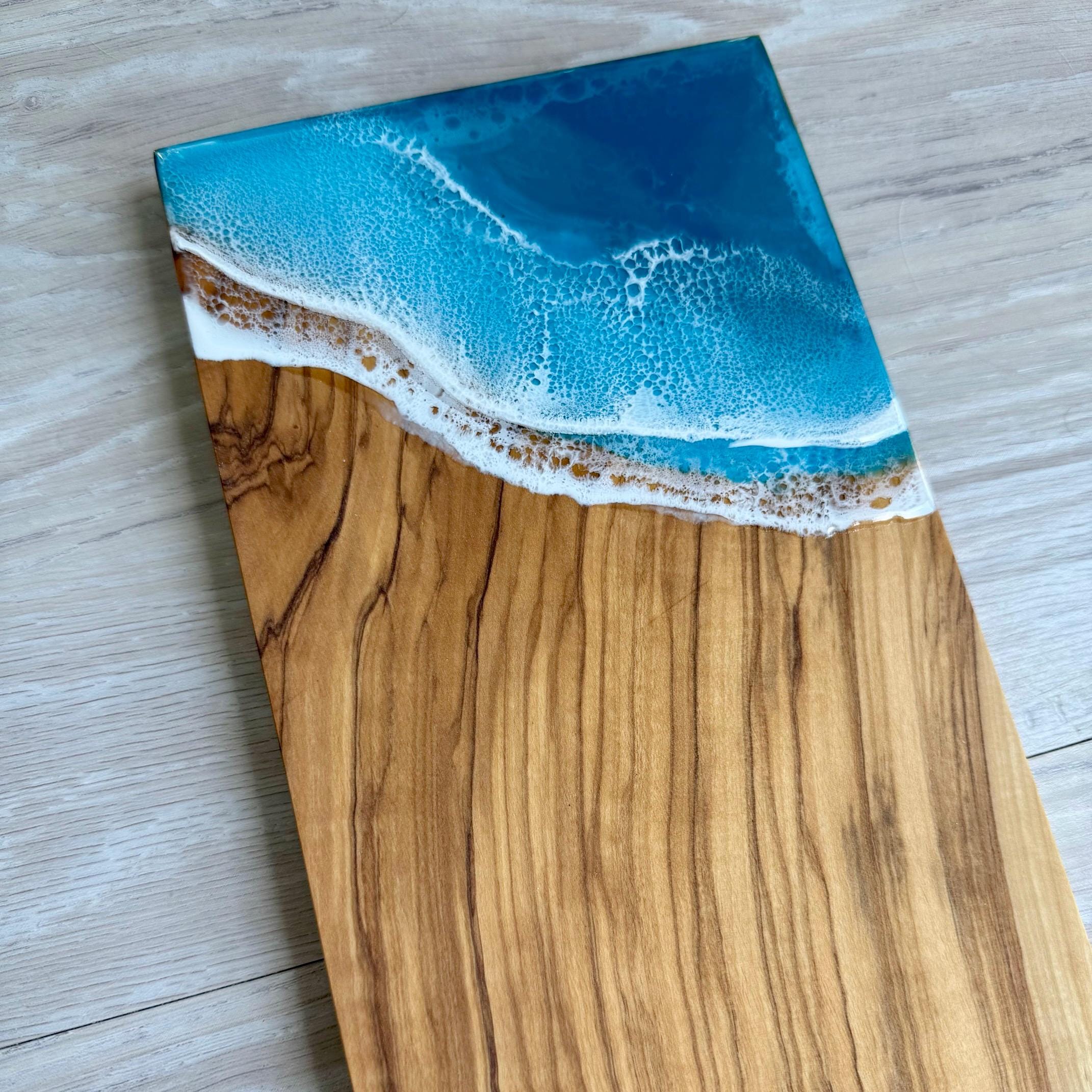One-of-a-kind resin ocean scene on an olive wood serving board. Perfect as a cheese board or charcuterie board. Display it in your kitchen or dining room as a piece of art.