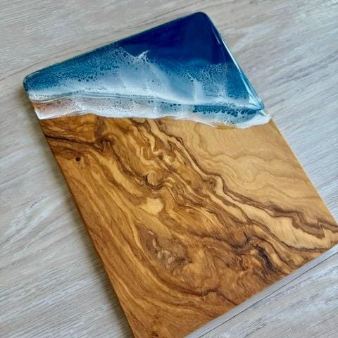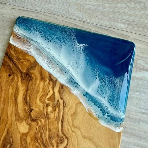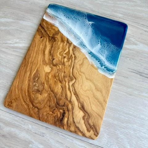 One-of-a-kind resin ocean scene on an olive wood serving board. Perfect as a cheese board or charcuterie board. Display it in your kitchen or dining room as a piece of art.
