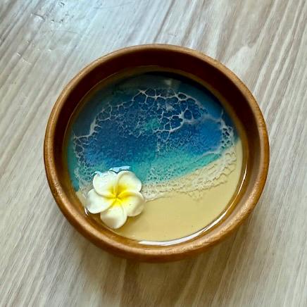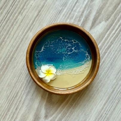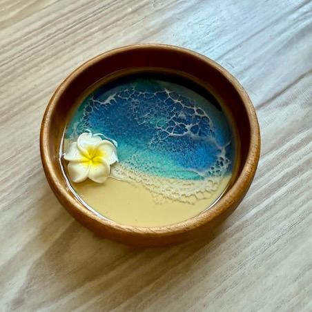 Multiple layers of resin are used to create a beautiful beach scene in an acacia wood bowl with a resin plumeria.