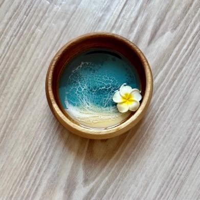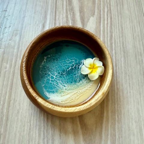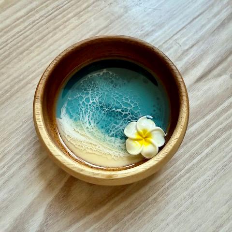 Multiple layers of resin are used to create a beautiful beach scene in an acacia wood bowl with a resin plumeria.