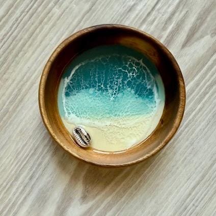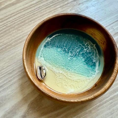 Multiple layers of resin are used to create a beautiful beach scene in an acacia wood bowl with a silver plated cowry seashell.