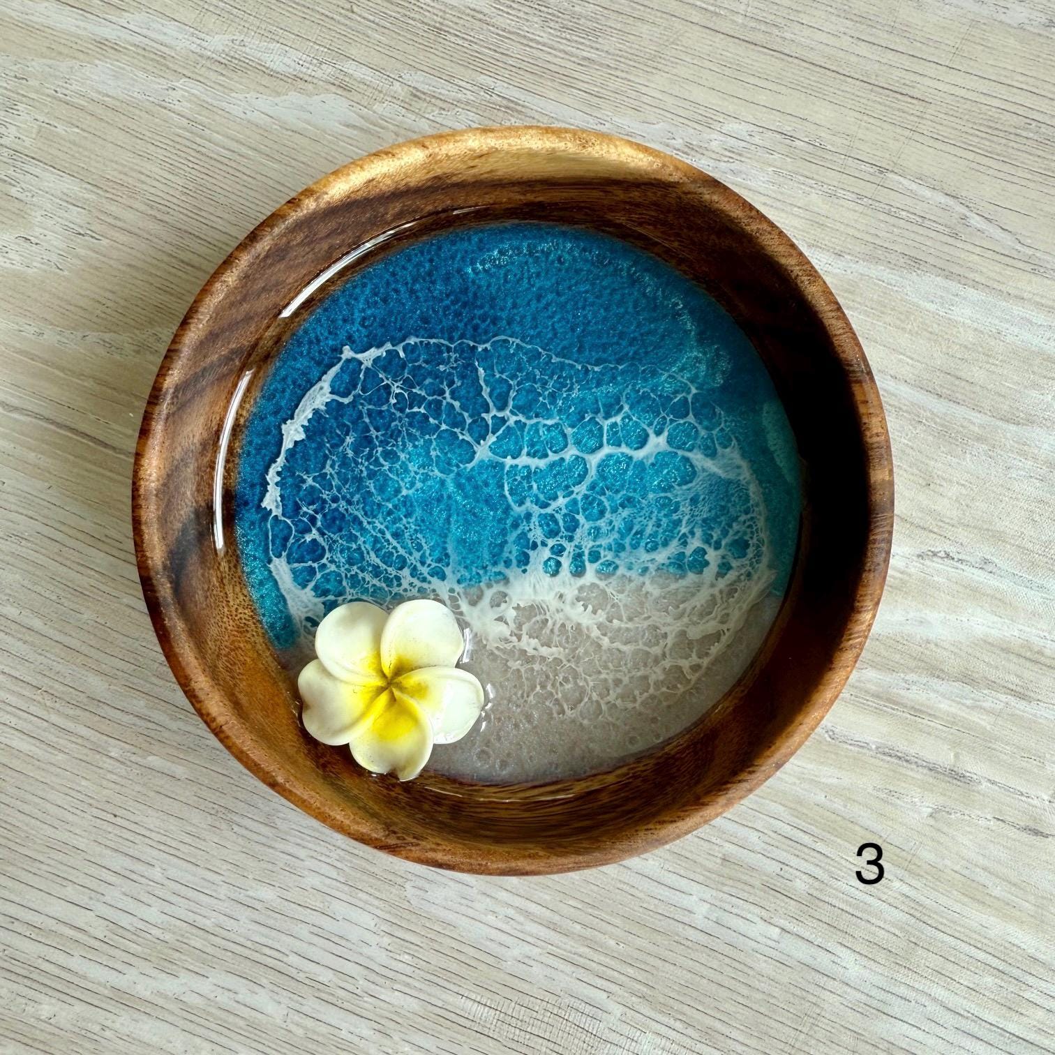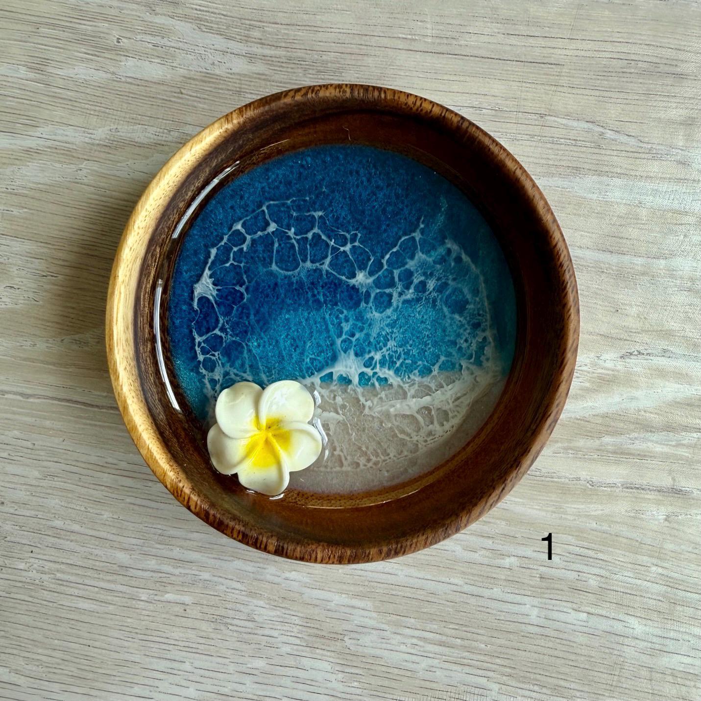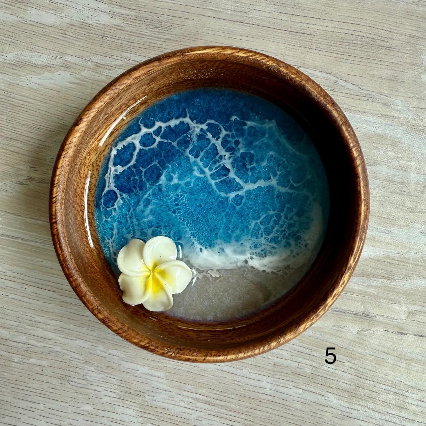 Multiple layers of resin are used to create a beautiful beach scene in an acacia wood bowl with a resin plumeria.
