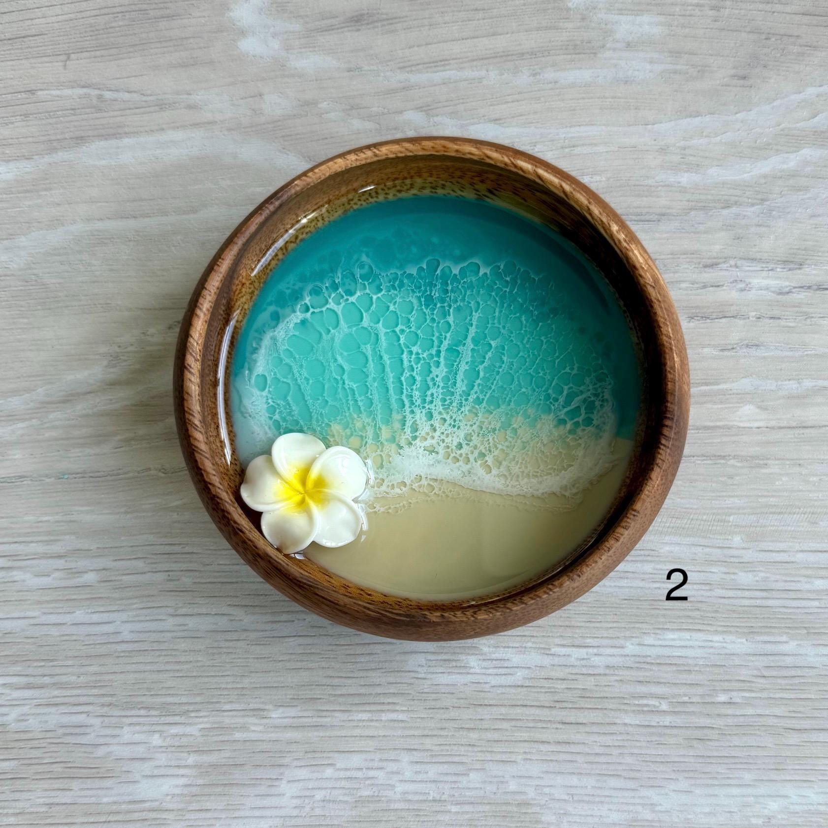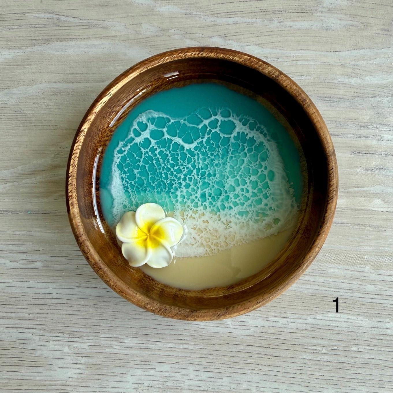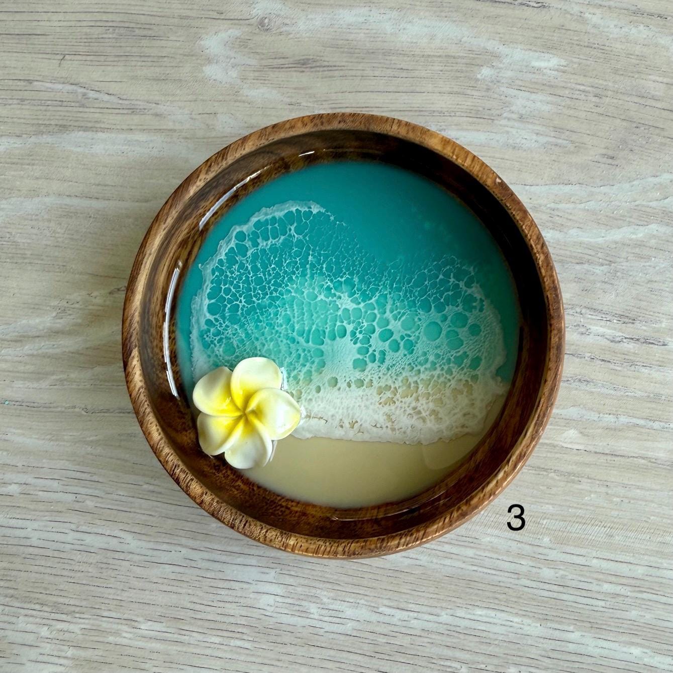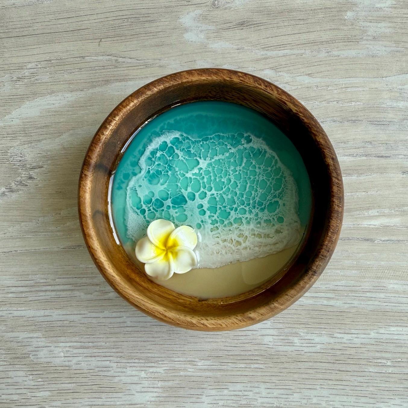 Multiple layers of resin are used to create a beautiful beach scene in an acacia wood bowl with a resin plumeria.