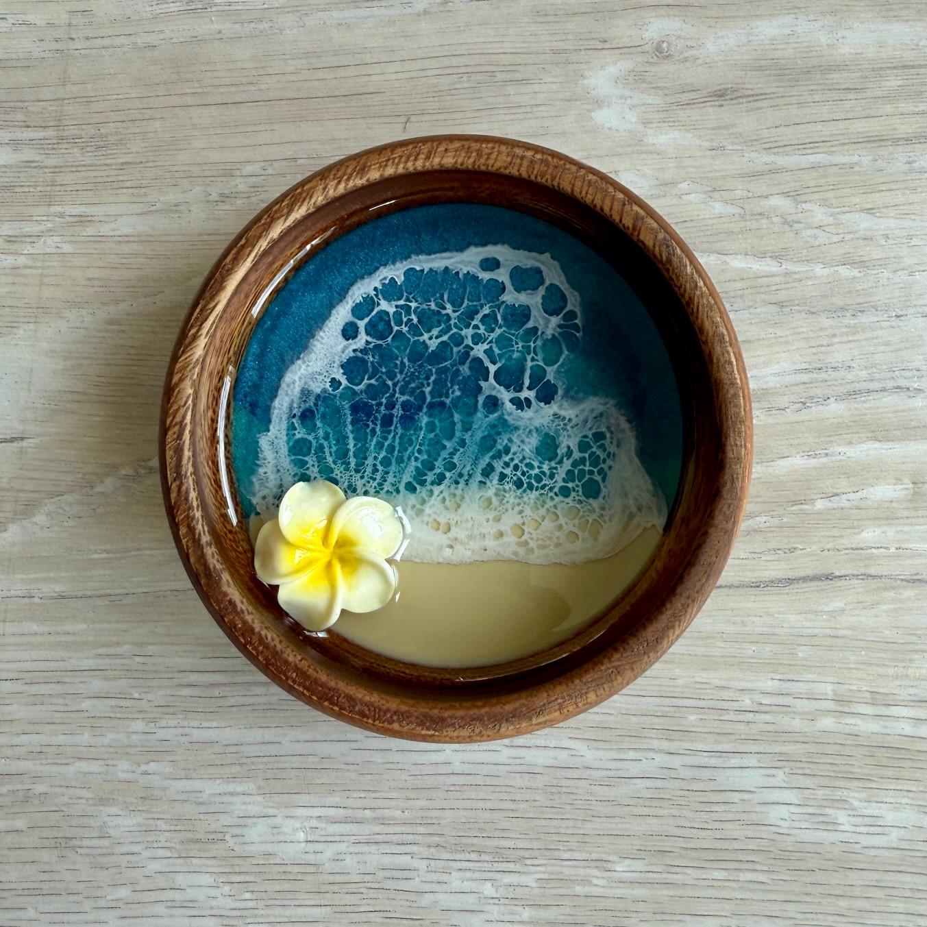 Multiple layers of resin are used to create a beautiful beach scene in an acacia wood bowl with a resin plumeria.