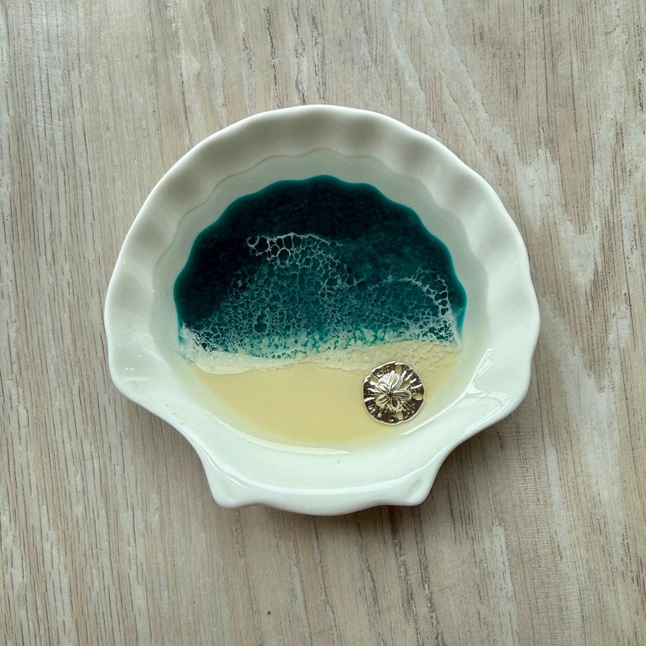 Multiple layers of resin are used to create a beautiful beach scene in a seashell shaped ceramic dish.