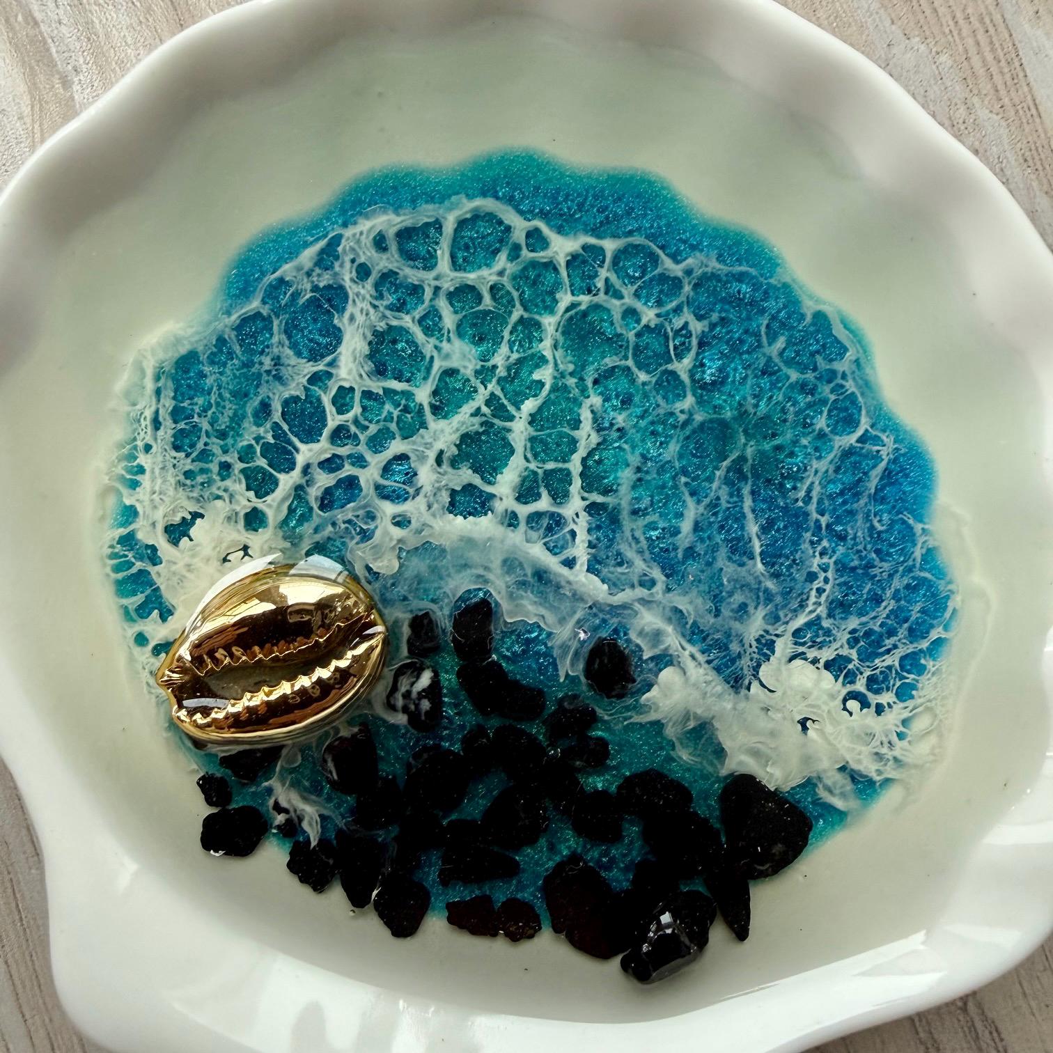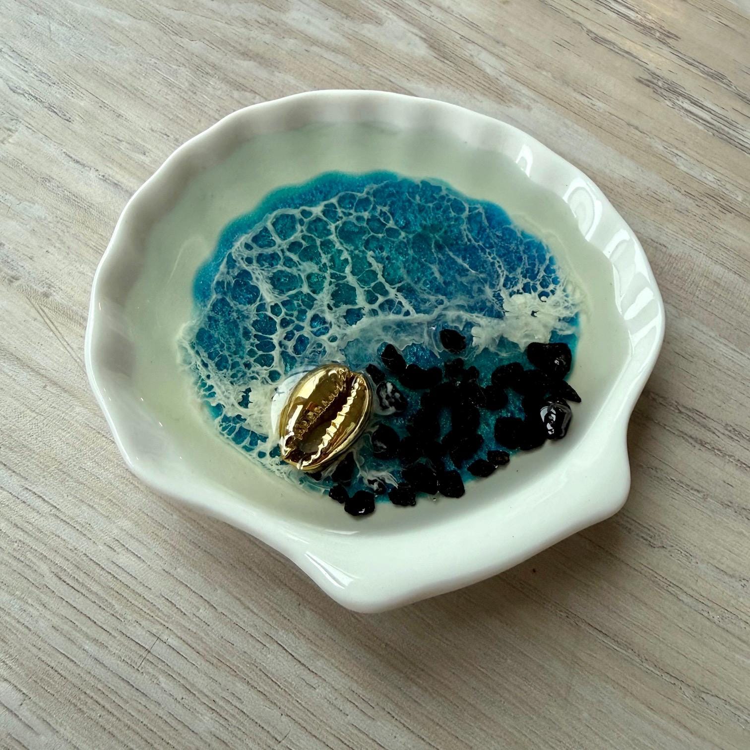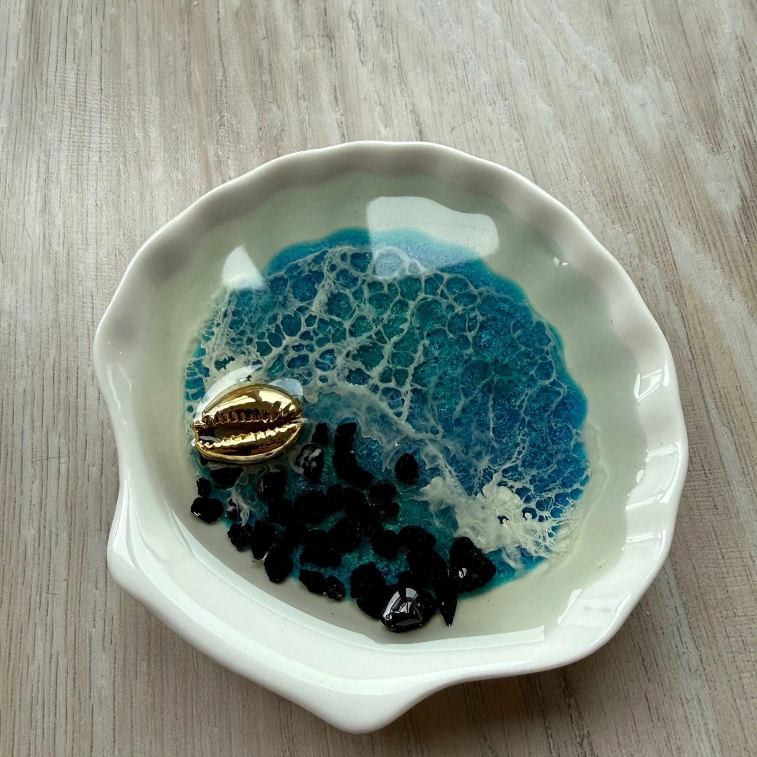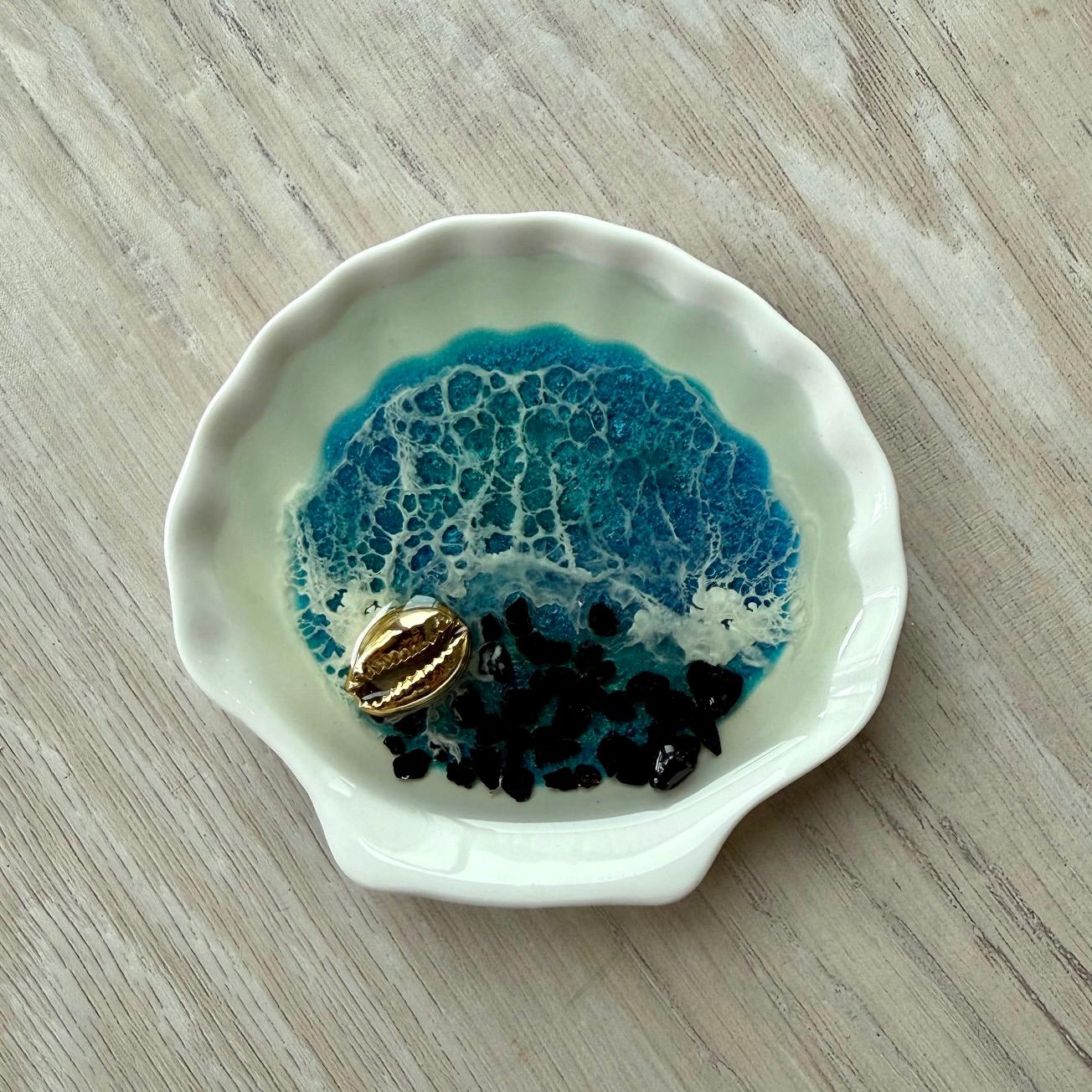 Multiple layers of resin are used to create a beautiful beach scene in a seashell shaped ceramic dish.