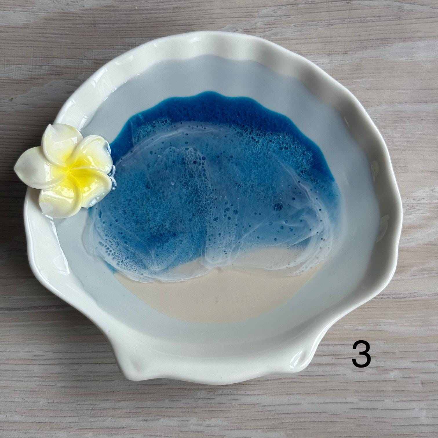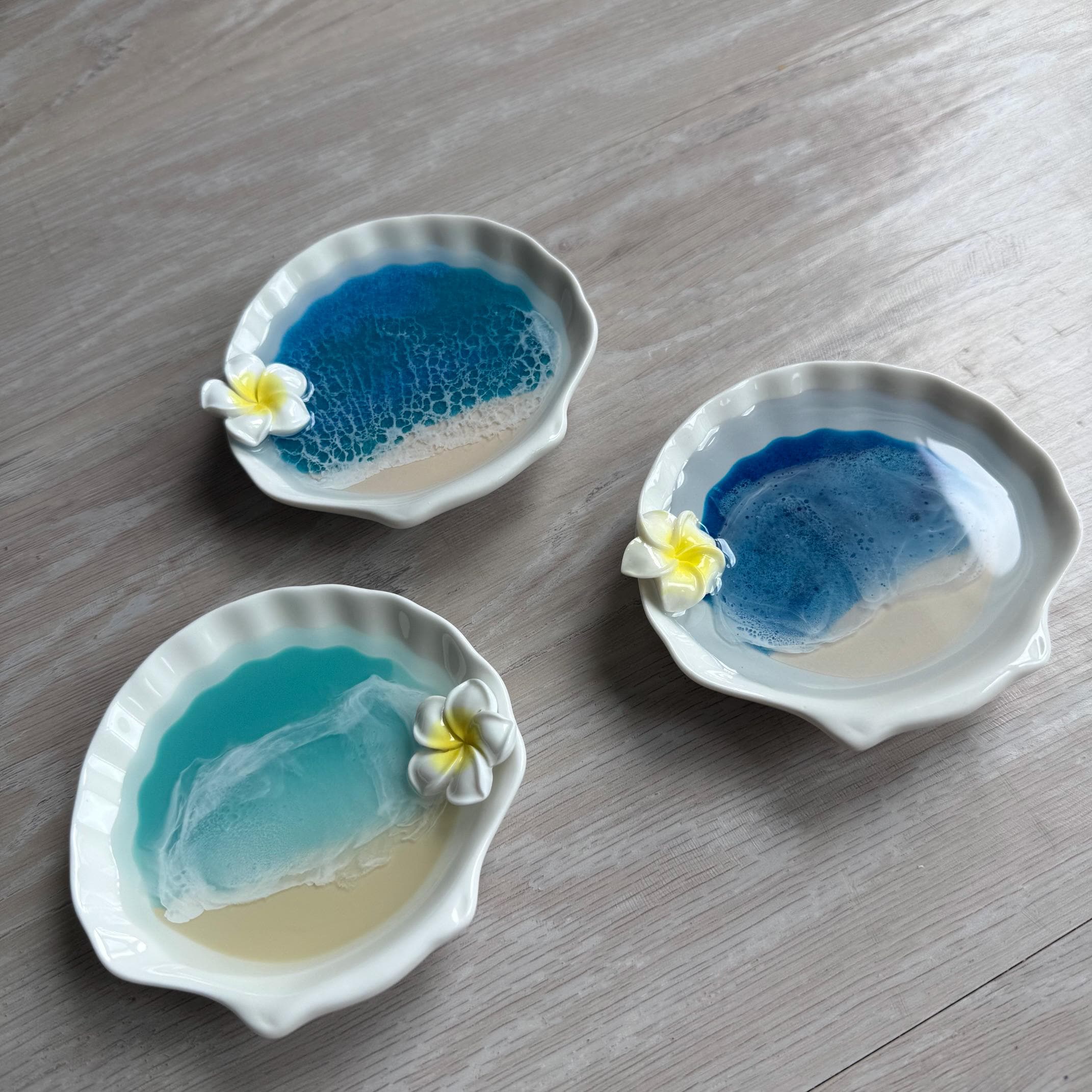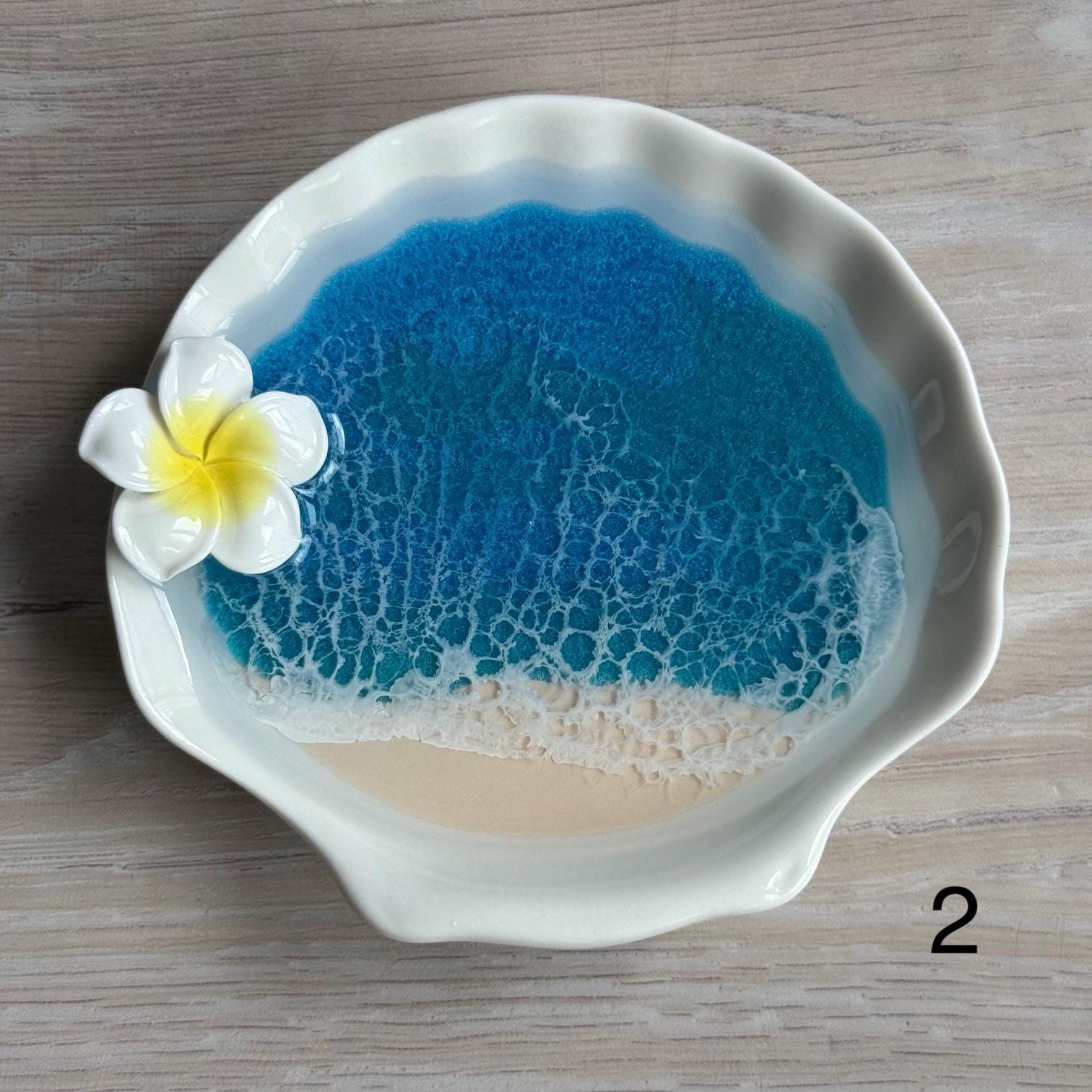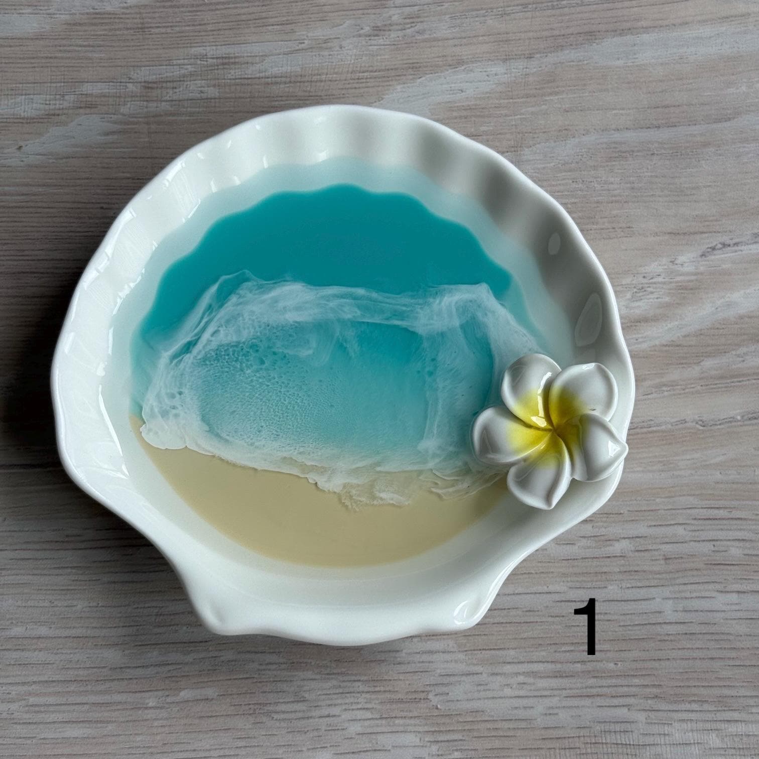 One-of-a-kind resin beach ring dish with a resin plumeria.