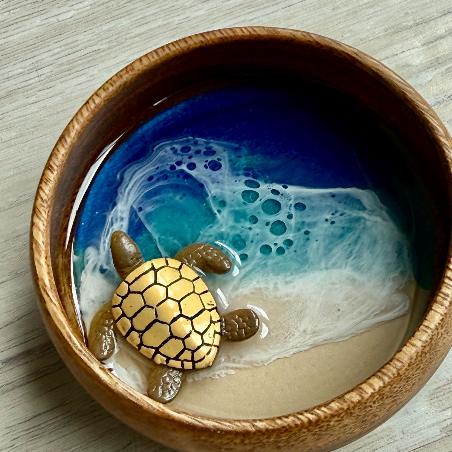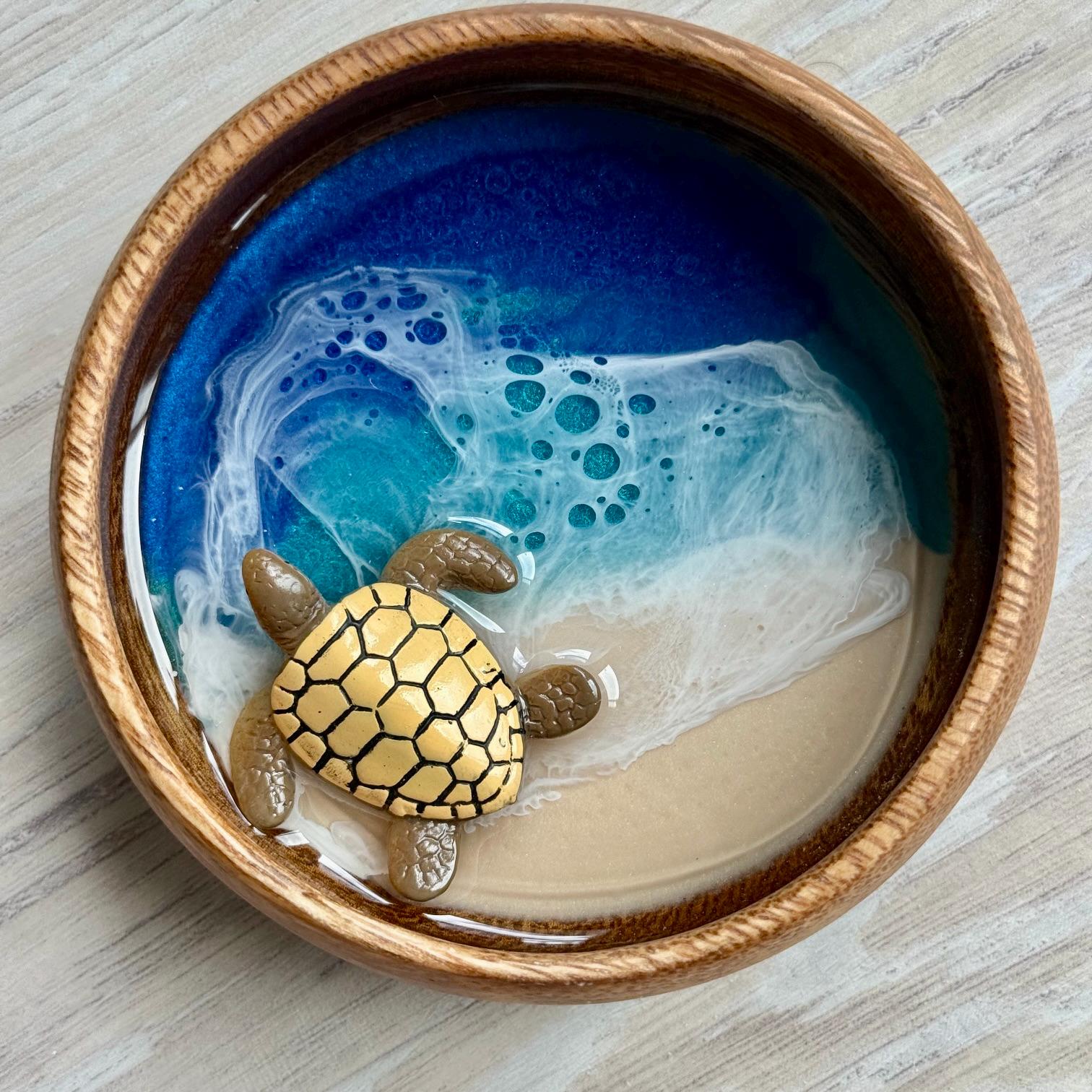 Multiple layers of resin are used to create a beautiful beach scene in an acacia wood bowl with a resin sea turtle.