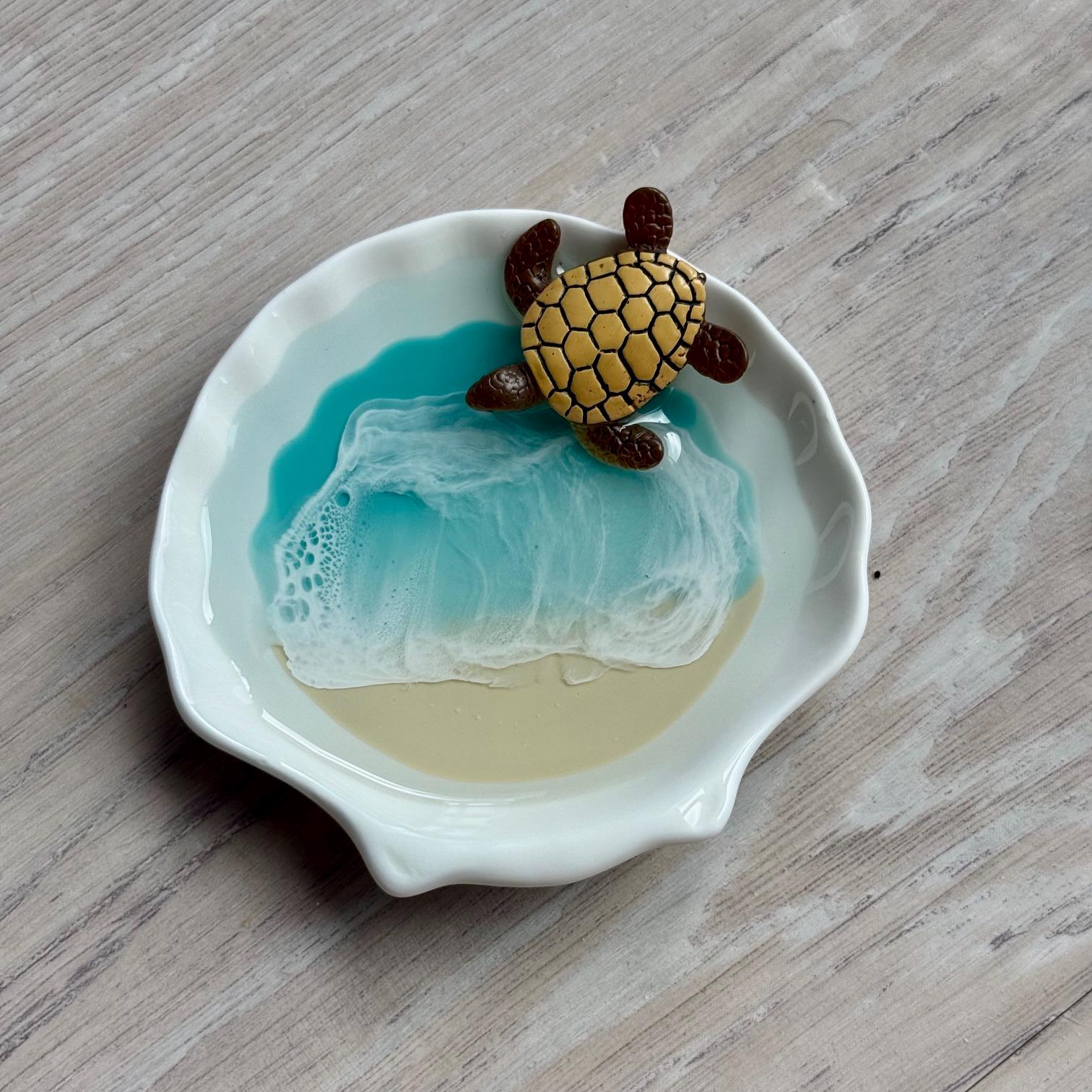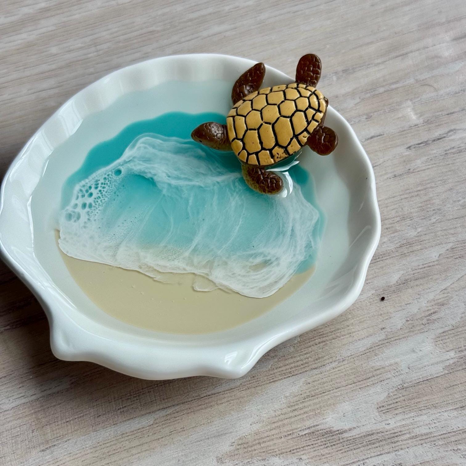 Multiple layers of resin are used to create a beautiful beach scene in a seashell shaped ceramic dish with a resin sea turtle.