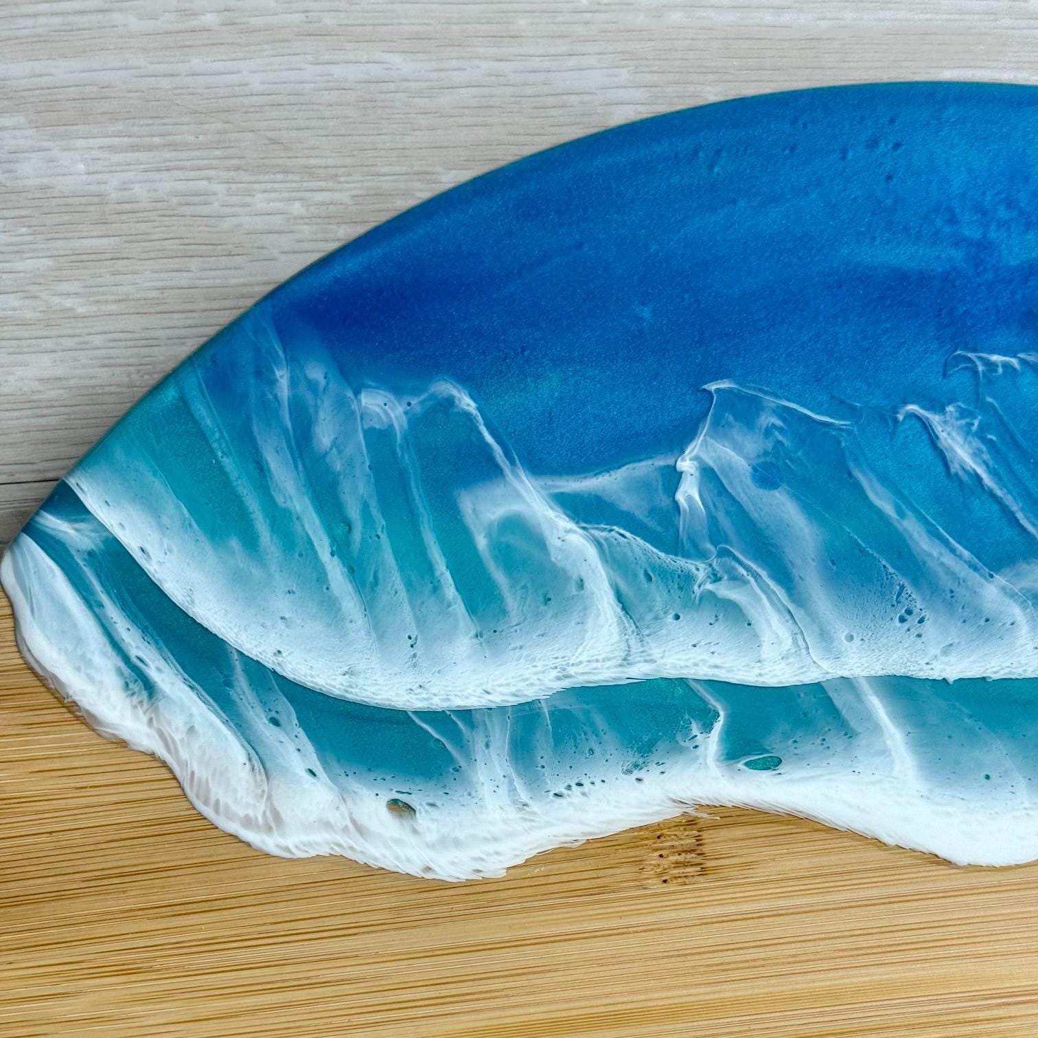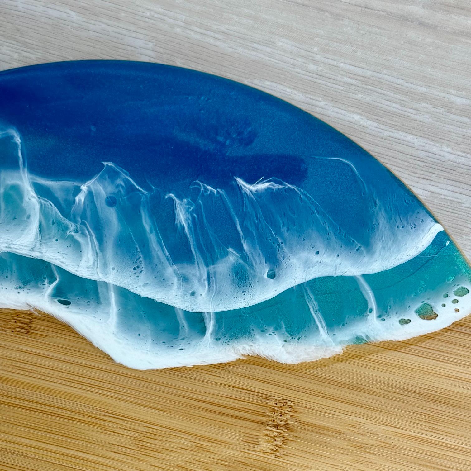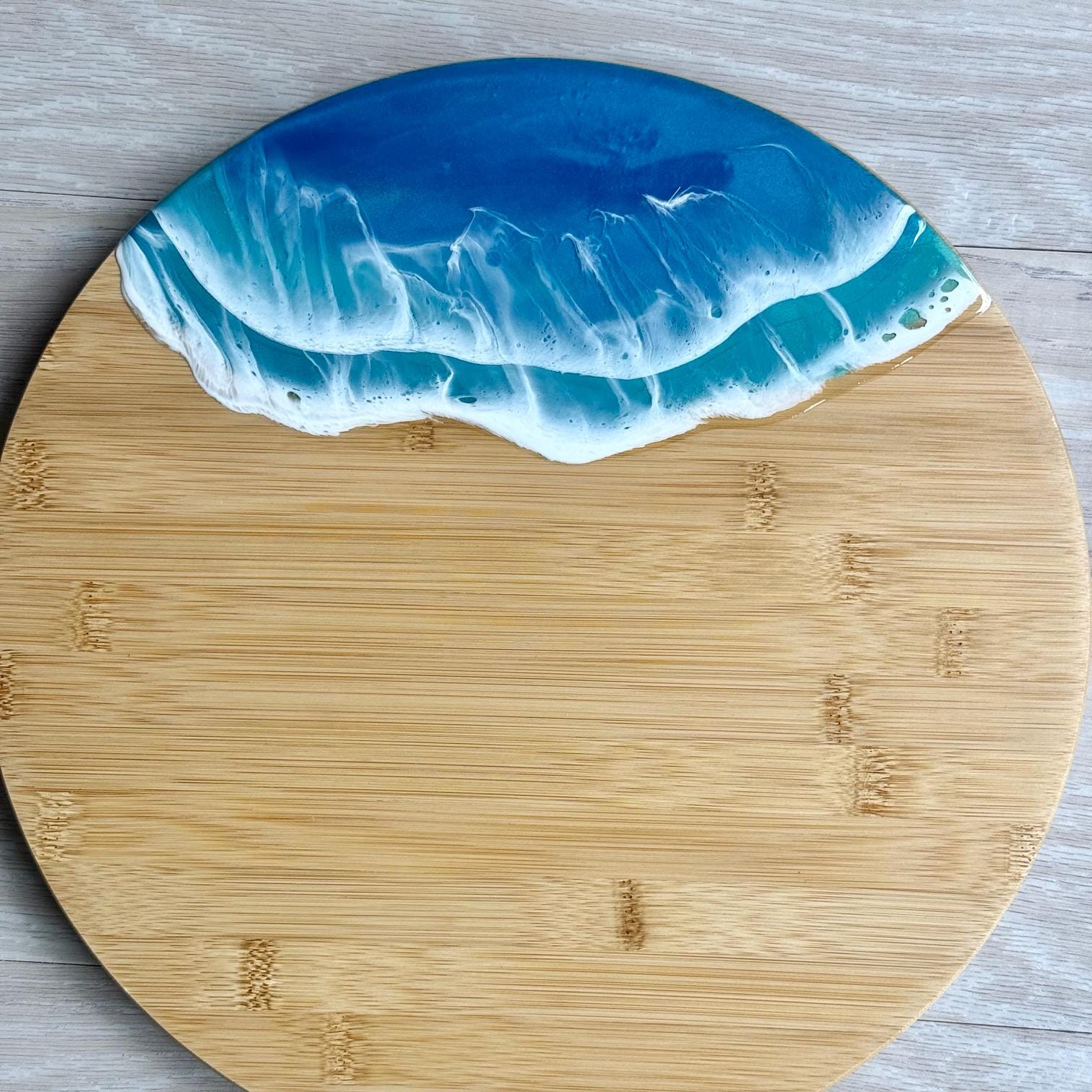 Multiple layers of resin are used to create this ocean scene, poured onto a bamboo lazy susan.