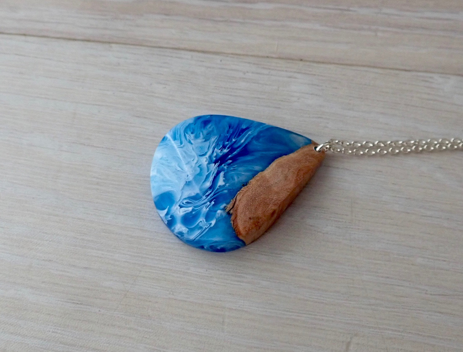 This resin wood necklace is a combination of Australian burl wood and resin with blue and white swirls. This modern beach style necklace has a boho feel that combines elements of the ocean and land in the incorporation of the resin swirls that mimic water and the natural wood. We use sterling silver for all of the parts and chain for a quality piece of jewelry that will last.