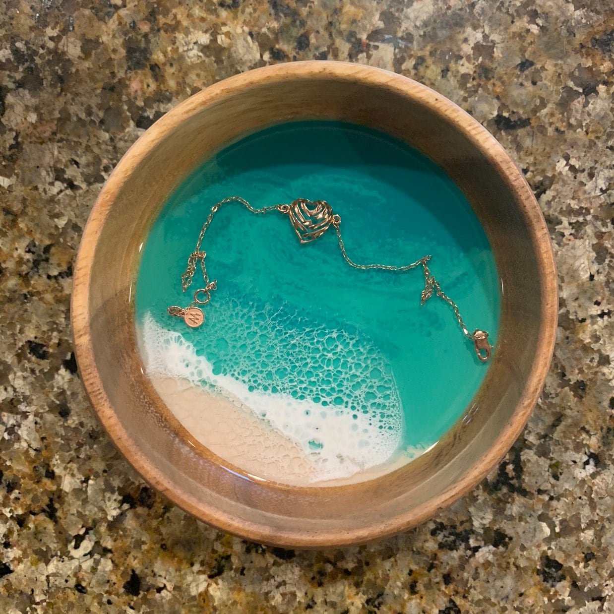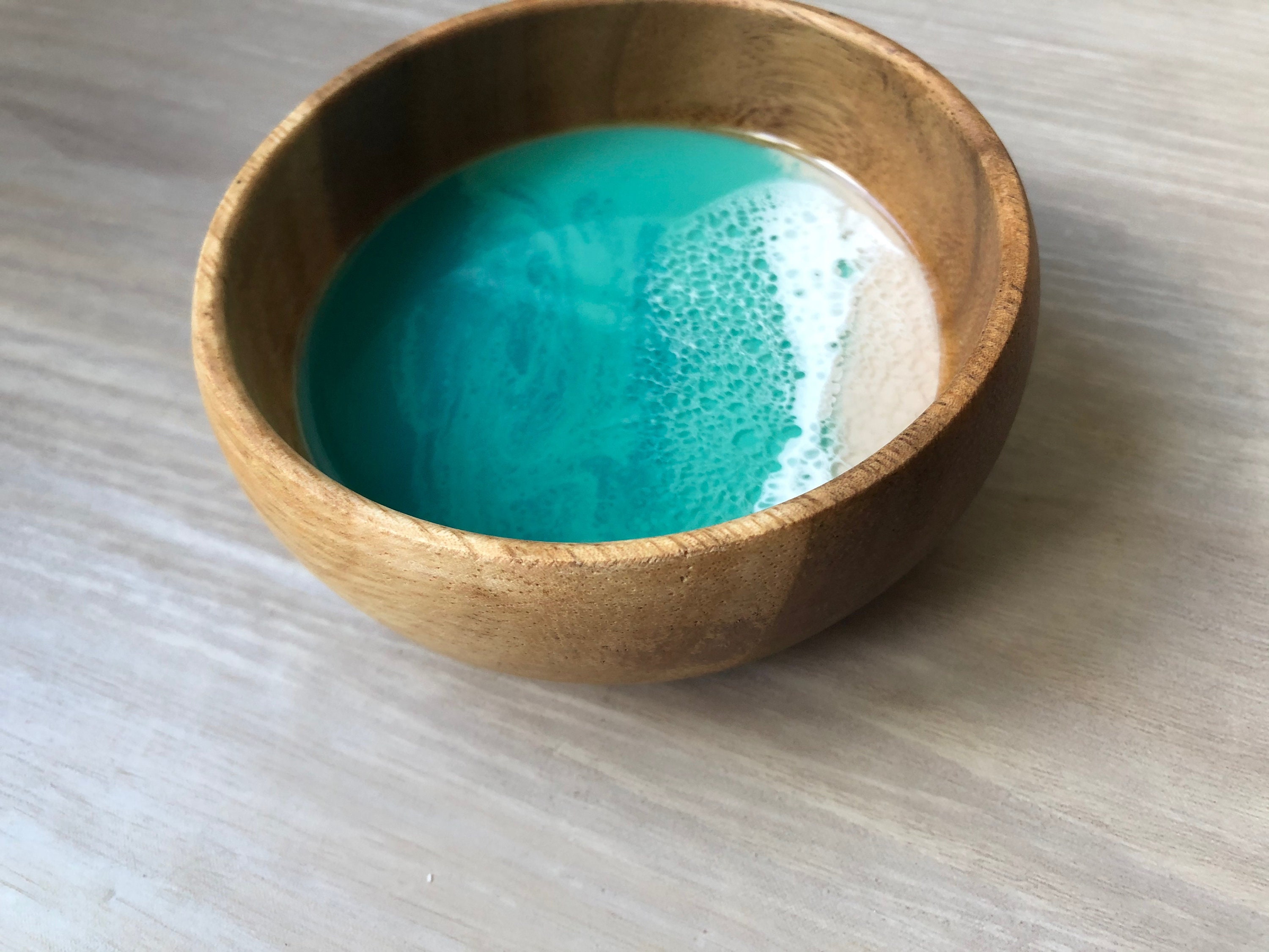 Multiple layers of resin are used to create a beautiful beach scene in an acacia wood bowl.