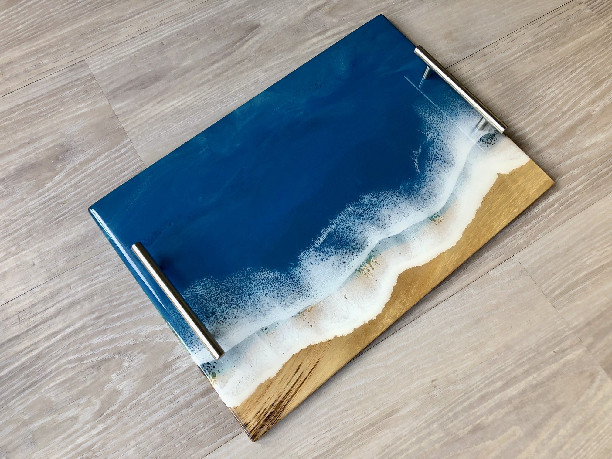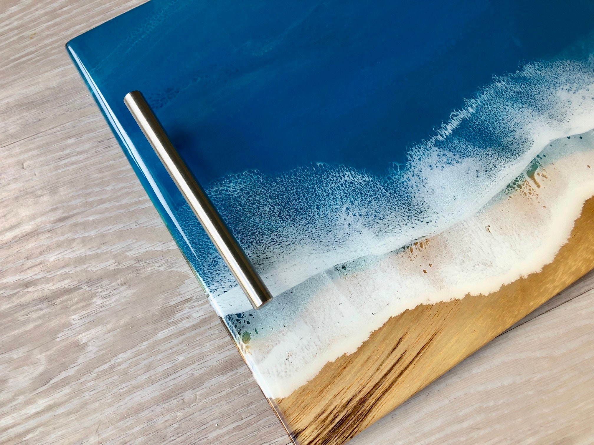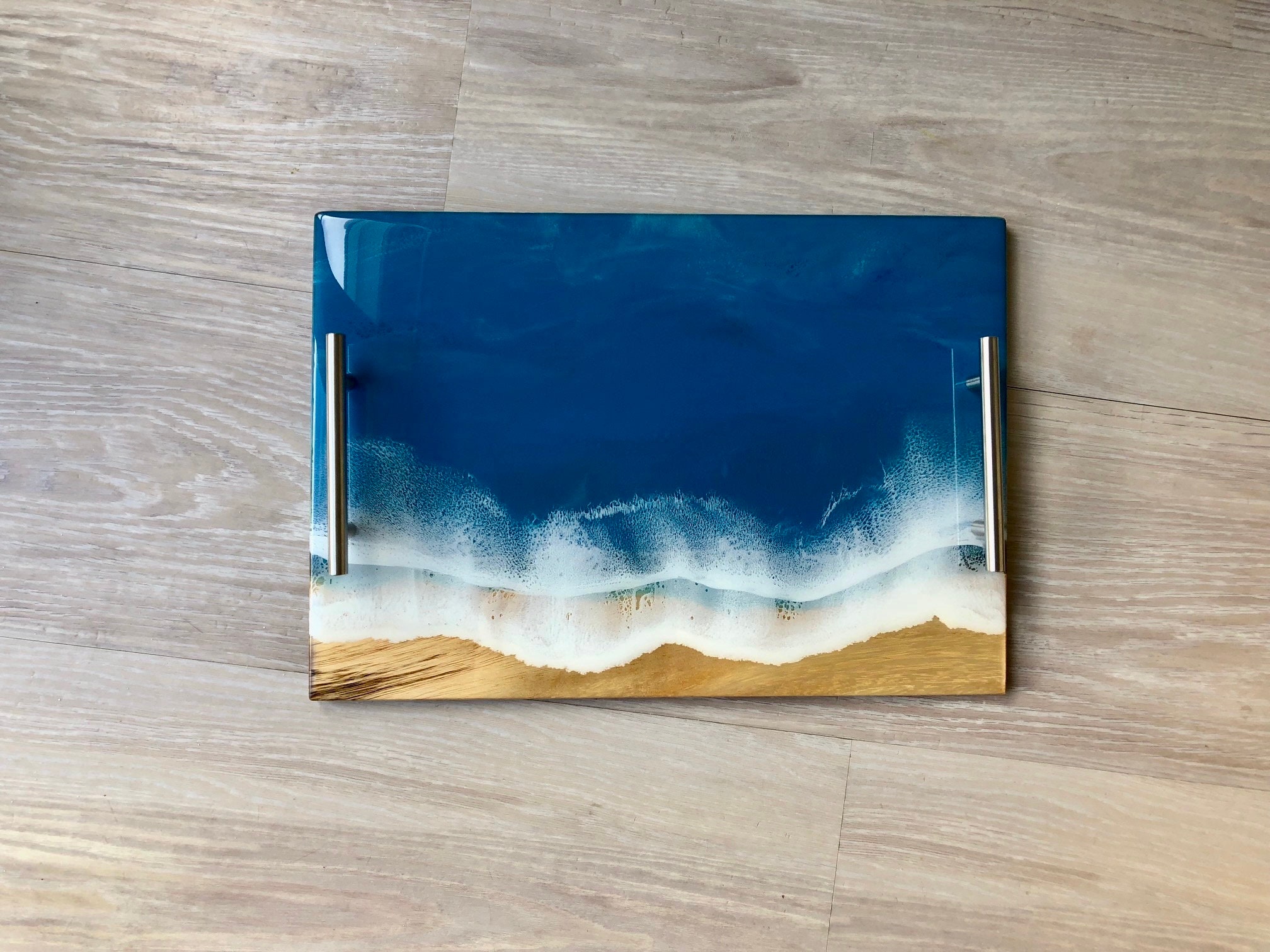 Multiple layers of resin are poured onto acacia wood to make this one of a kind beach inspired serving tray.
