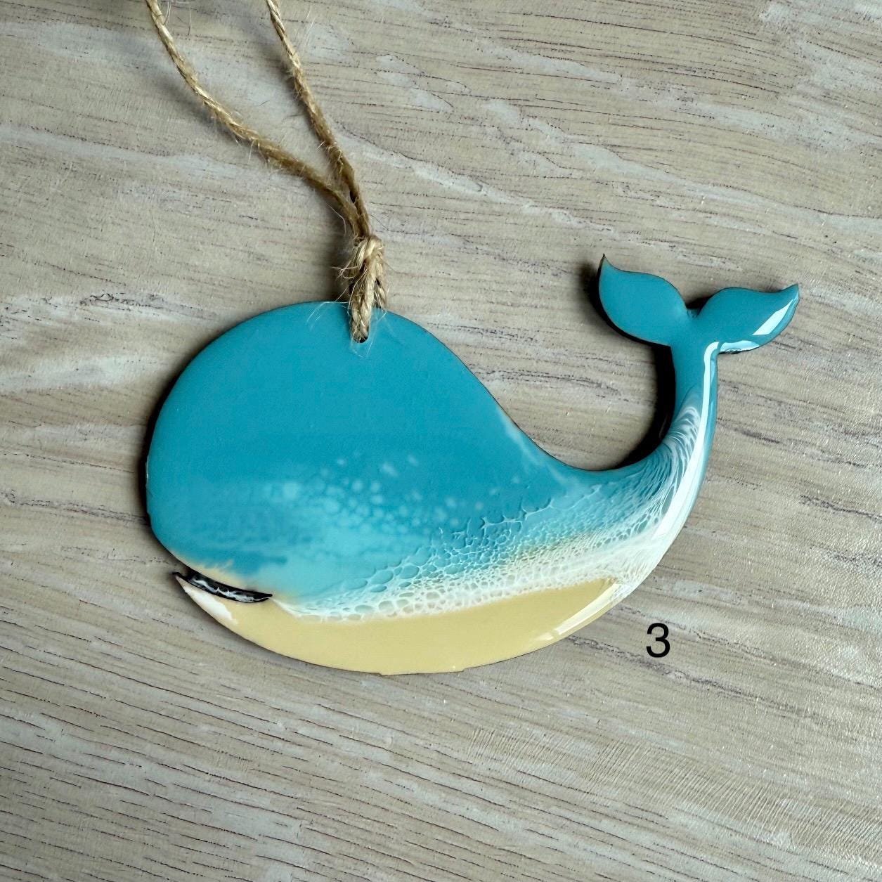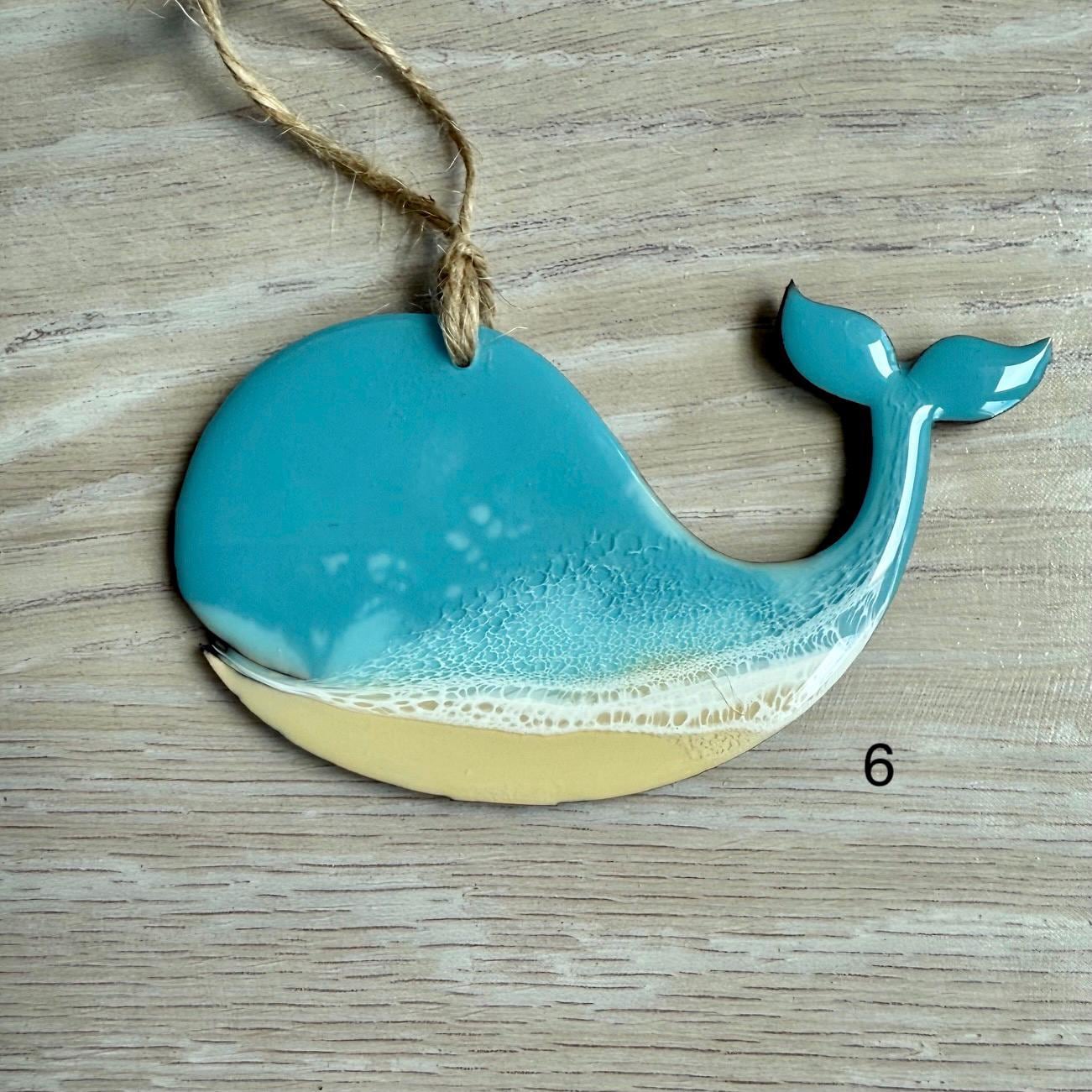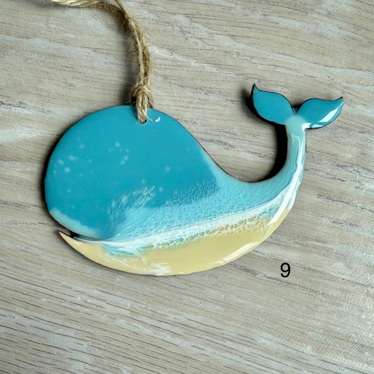 A resin beach scene is poured onto plywood, creating this cute whale ornament.