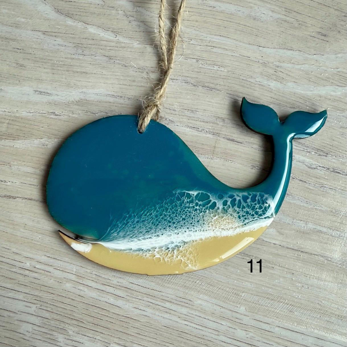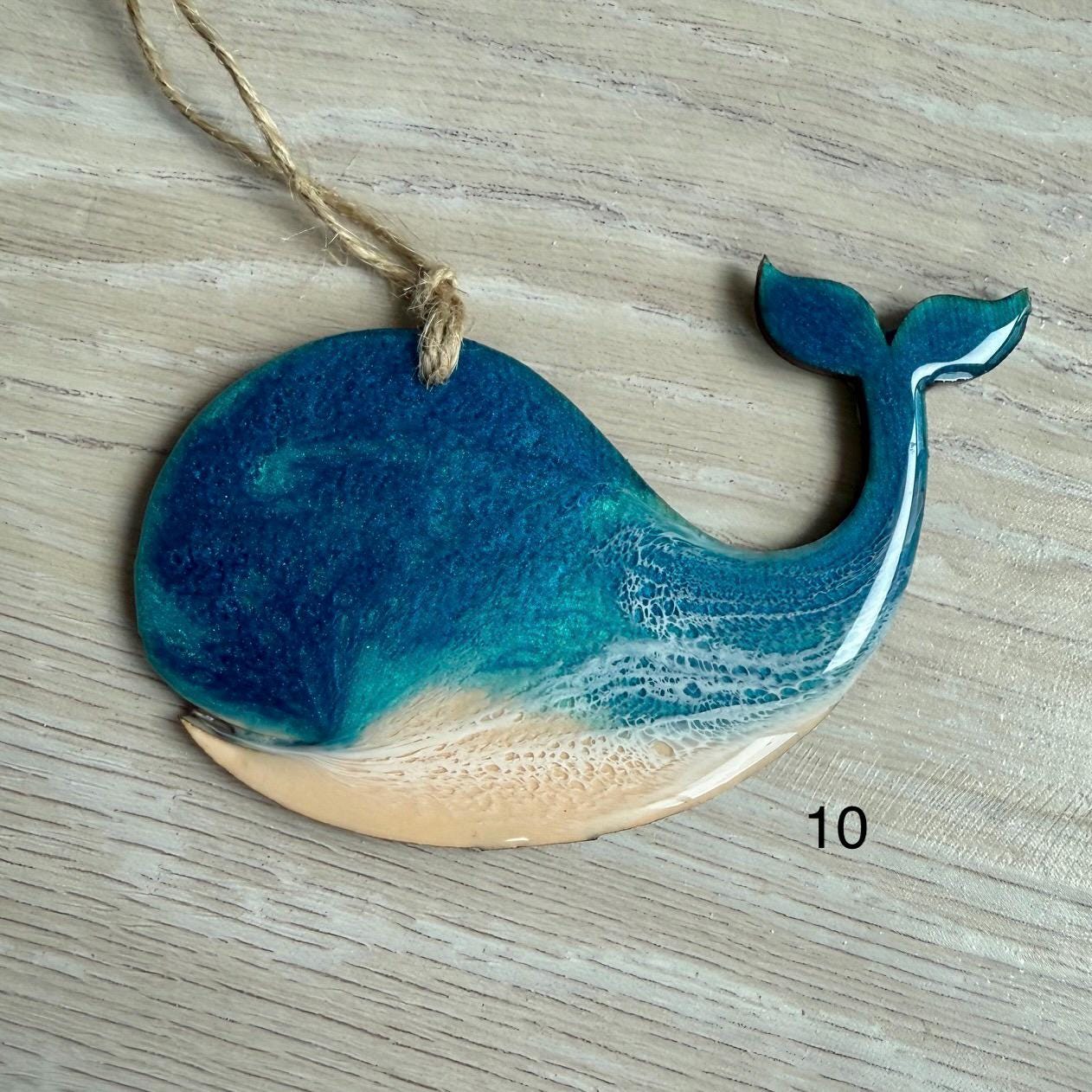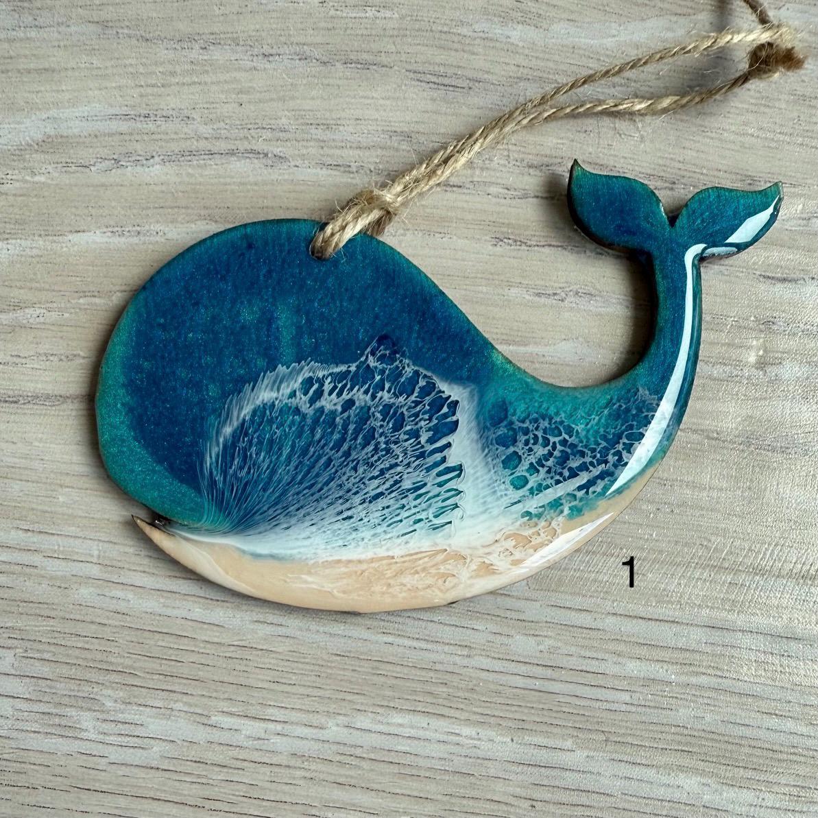 A resin beach scene is poured onto plywood, creating this cute whale ornament.