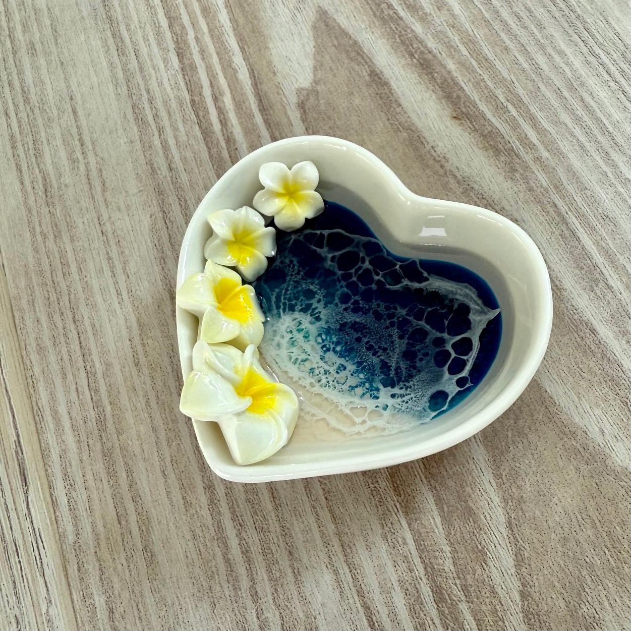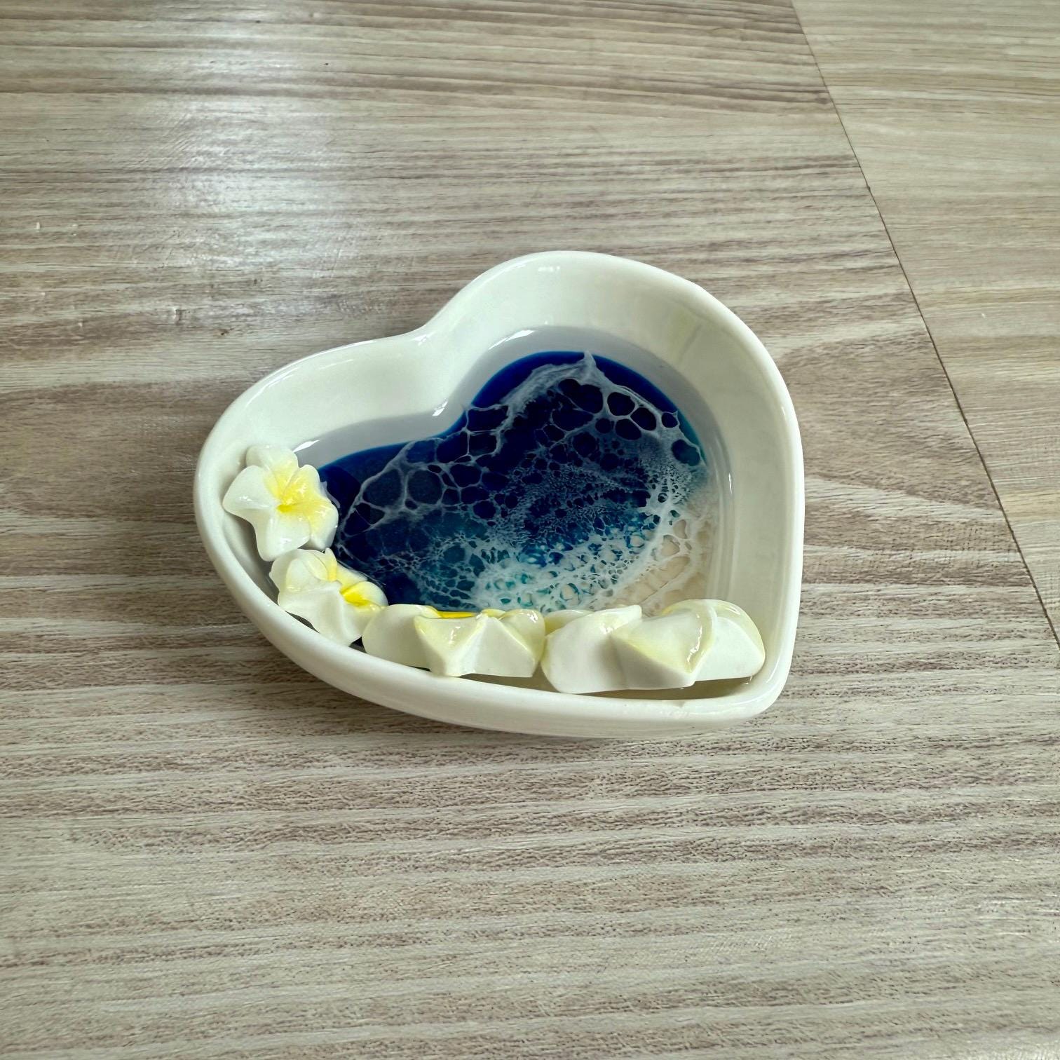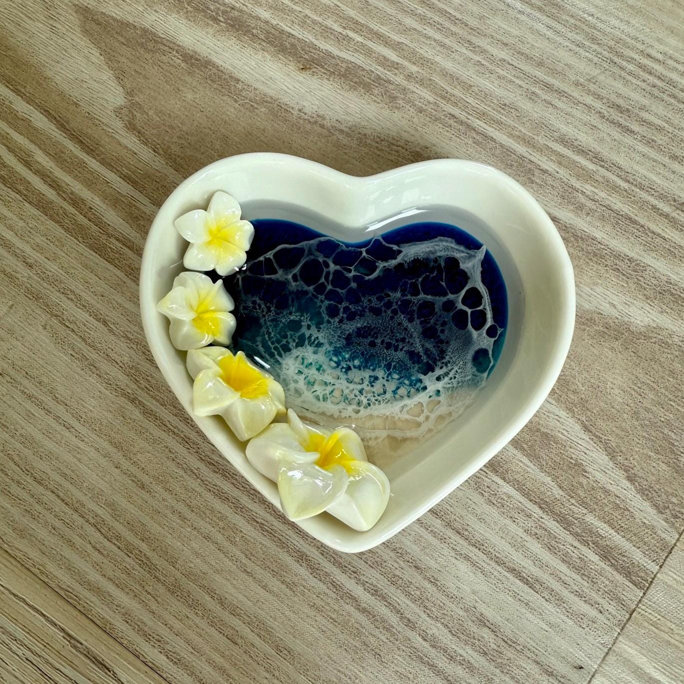 Multiple layers of resin are used to create a beautiful beach scene in a heart shaped ceramic dish with resin plumerias.